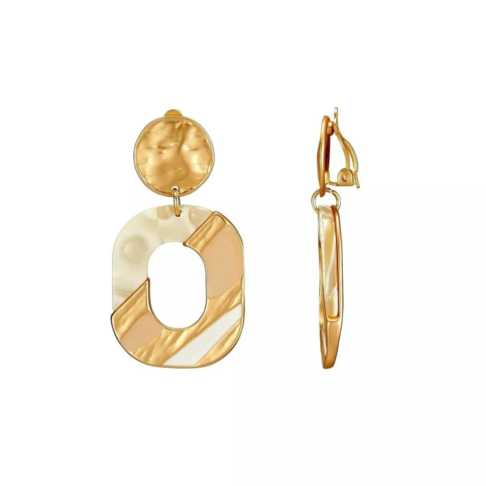 Dessa stilfulla clipsörhängen från Belle Miss är en perfekt blandning av guld, beige och vitt vilket skapar en harmonisk och tidlös look – perfekt för både vardag och fest.