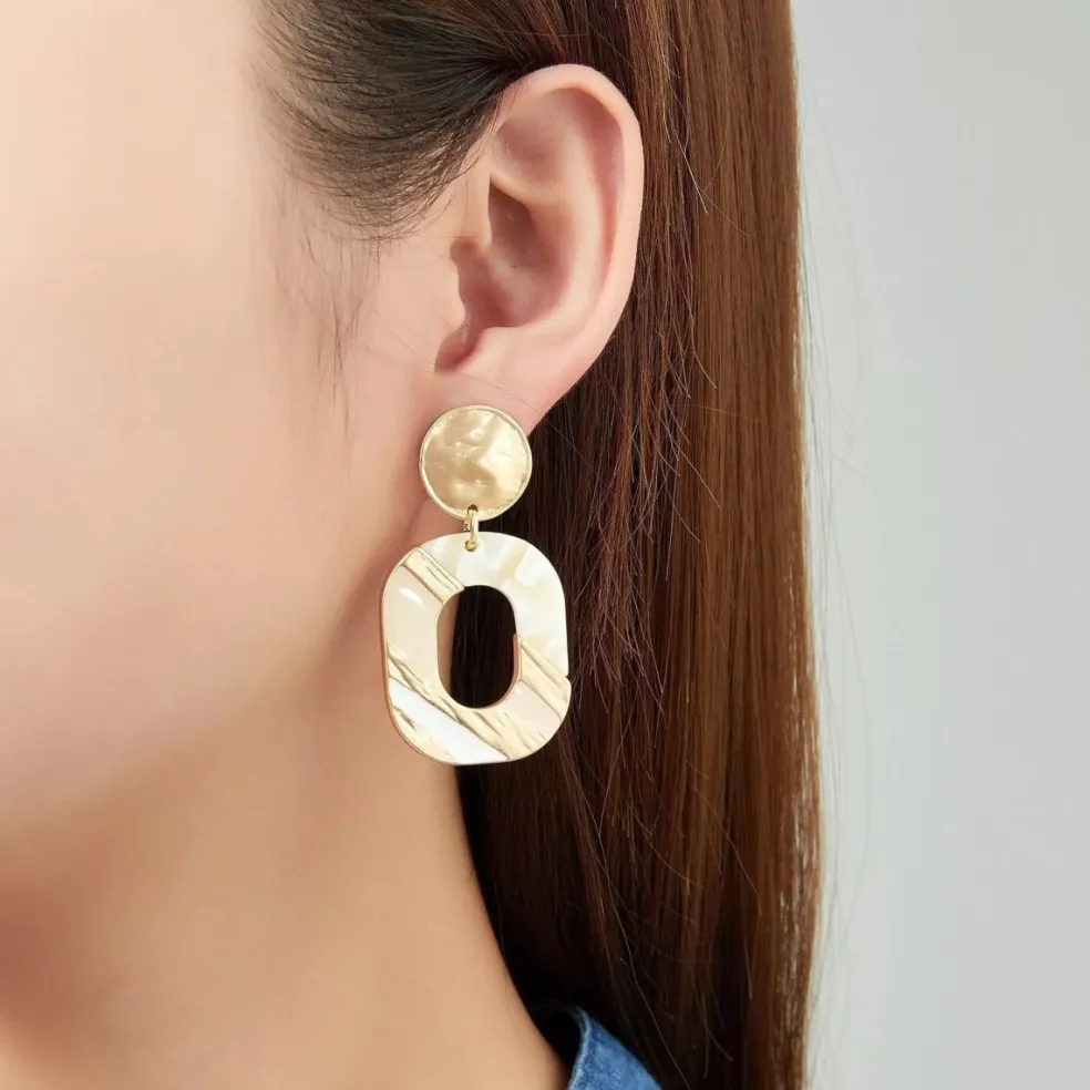 Tillverkat i högkvalitativt brass, kombinerat med en stilren platta av akryl i en vacker mixad grön nyans utstrålar detta örhänge inte bara elegans utan även modern charm.