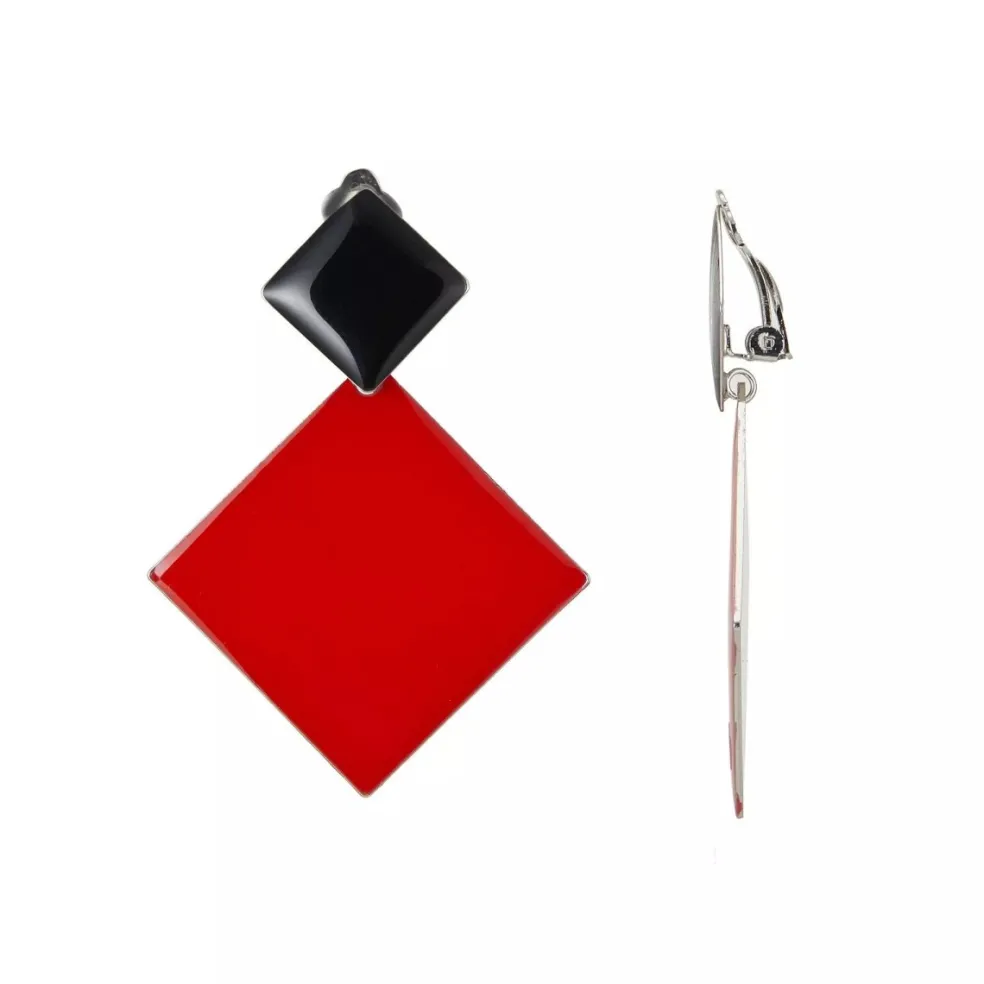 Här ser du modellen Fawara, ett stilfullt och djärvt smycke i rött och svart schackmönster. Med sin unika design och bekväma clipsfunktion är dessa örhängen perfekta för dig som vill addera en modern elegans till din look – utan att behöva piercade öron.
