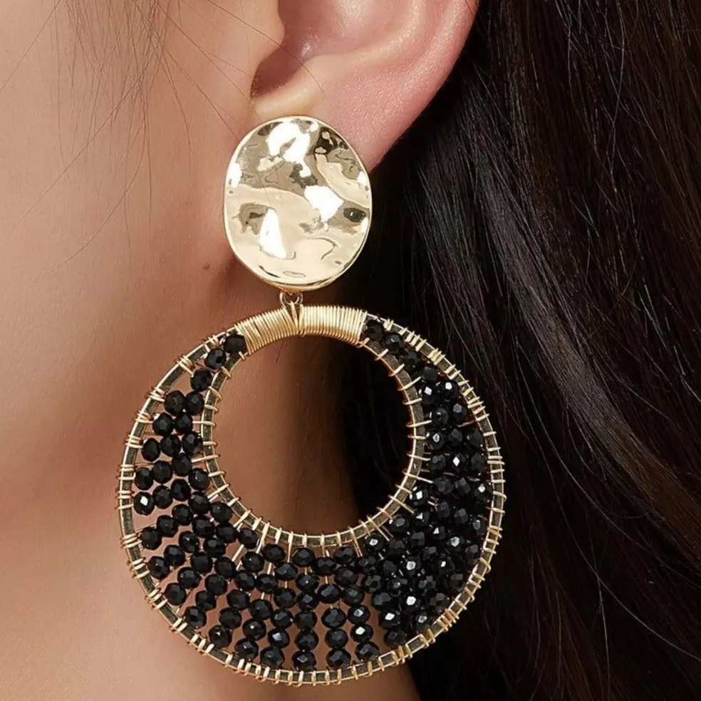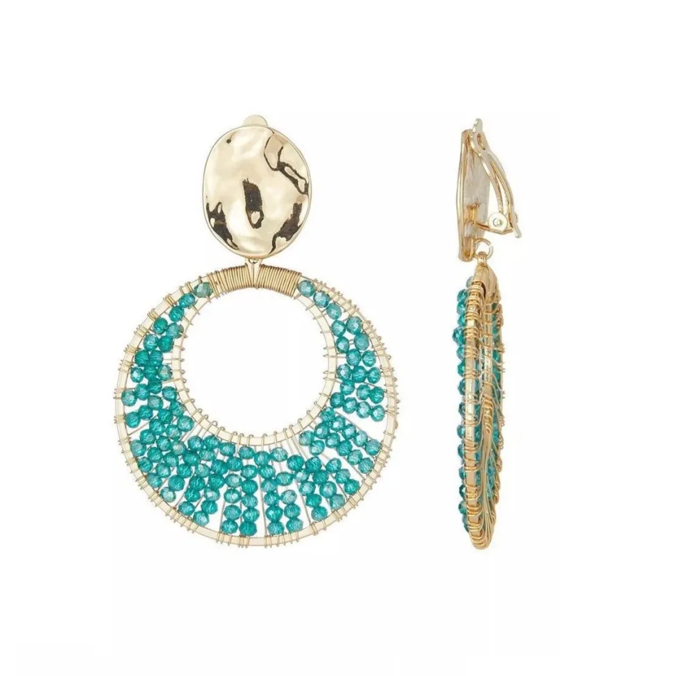 Ett par ganska stora clipsörhängen i skinande guldfärg och vackra turkosa kristaller. Med sin iögonfallande design och eleganta kombination av färger, utstrålar de en lekfull känsla. De turkosa kristallerna ger örhängena en livlig och fräsch touch som verkligen fångar uppmärksamheten, medan den skinande guldfärgen adderar en lyxig glans.