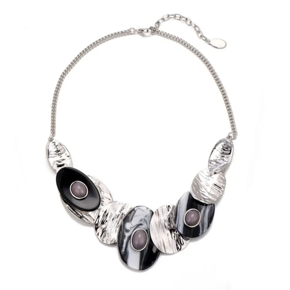 Med sina hamrade metalldelar i silverfärg och svarta samt svartvita cirklar i akryl och resin, skapar detta halsband en modern och stilren design som både är iögonfallande och sofistikerad. Kombinationen av svart och silver ger en cool, elegant och samtidigt tidlös känsla.
