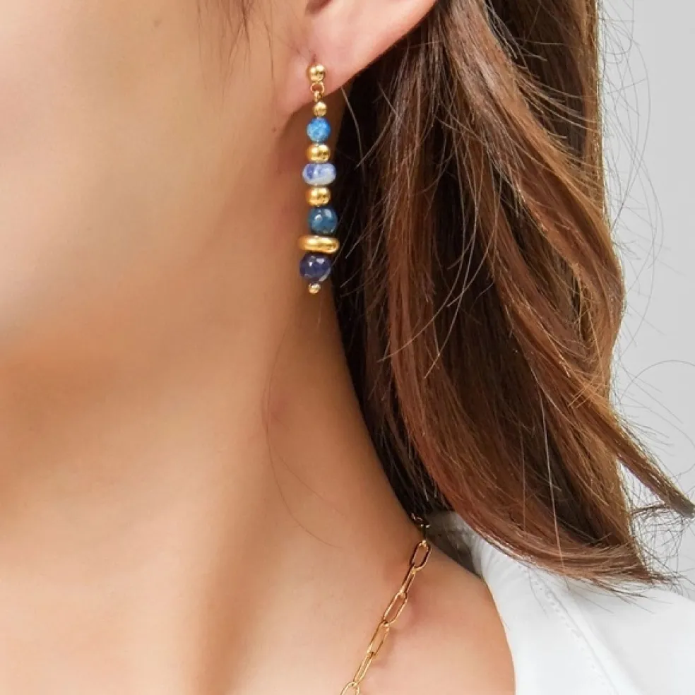 Upptäck elegansen i varje detalj med Vitalie – långa, utsökta örhängen från Belle Miss Paris. Denna modell kombinerar naturliga stenar i vackra blå nyanser, från mjukt himmelsblått till djup marinblått, vilket skapar en harmonisk färgpalett som för tankarna till hav och himmel. Varje sten är unik, vilket gör varje par örhängen personligt och levande.