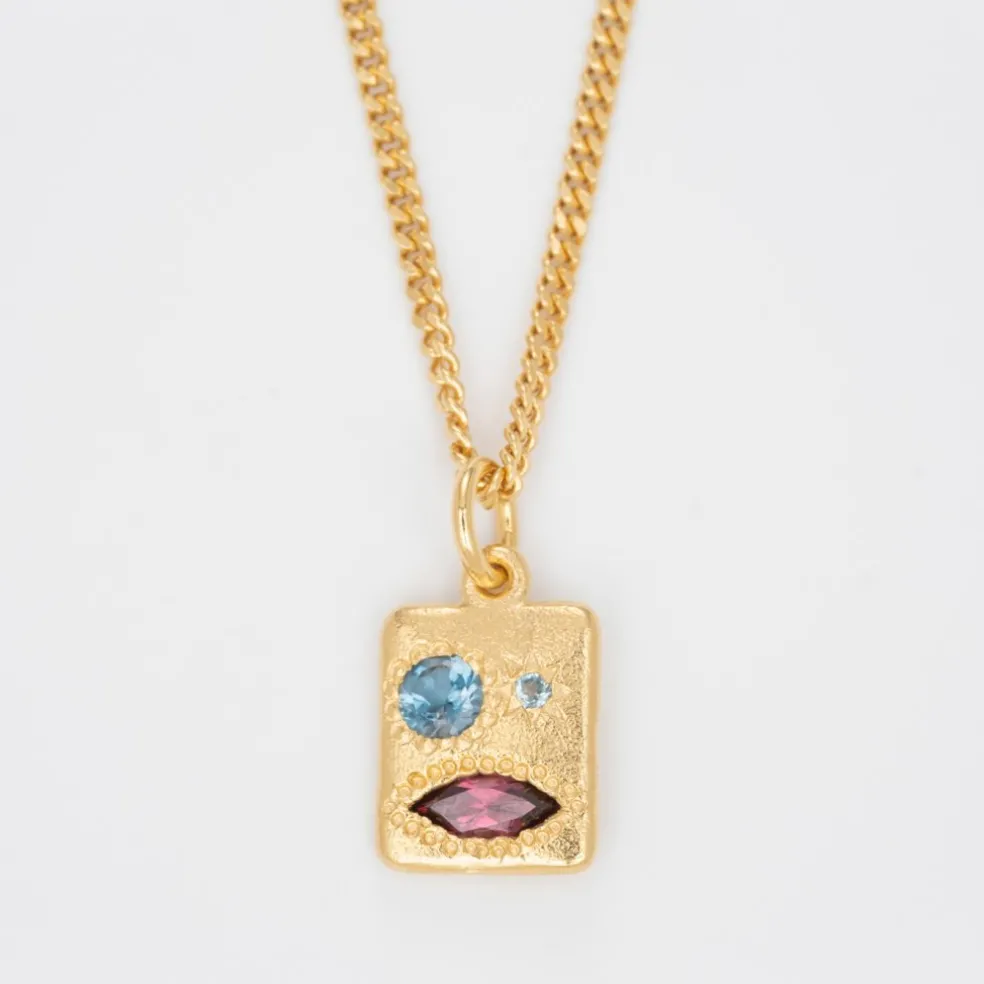 Sött och charmigt halsband i 24 karats guldpläterat silver. Det dyrbara lilla ansiktet är handskuret och utsmyckad med Rhodolite granat och blandade nyanser av blå Topas ädelstenar i ögonen.