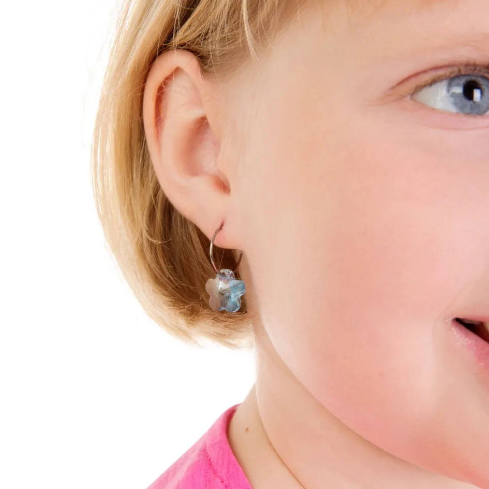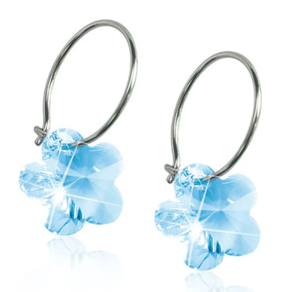 Hudvänliga örhängen i titan med en blommformad kristall från Blomdahl.