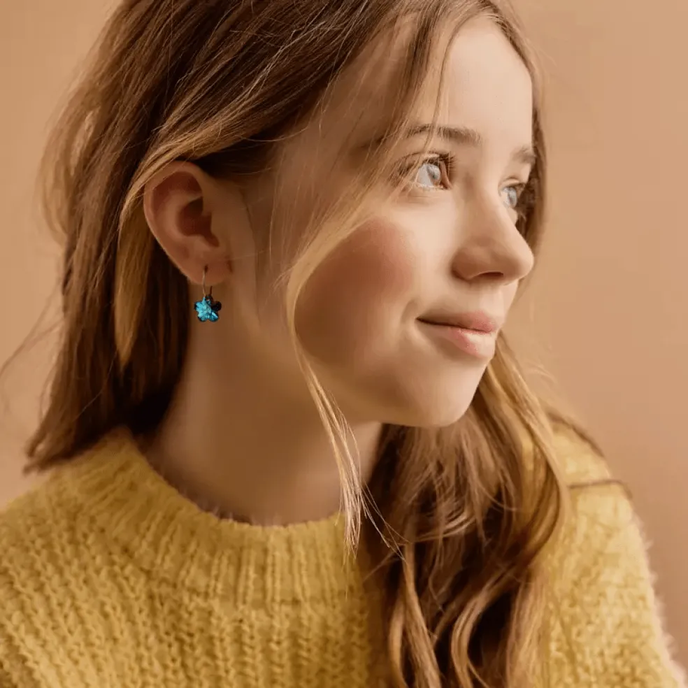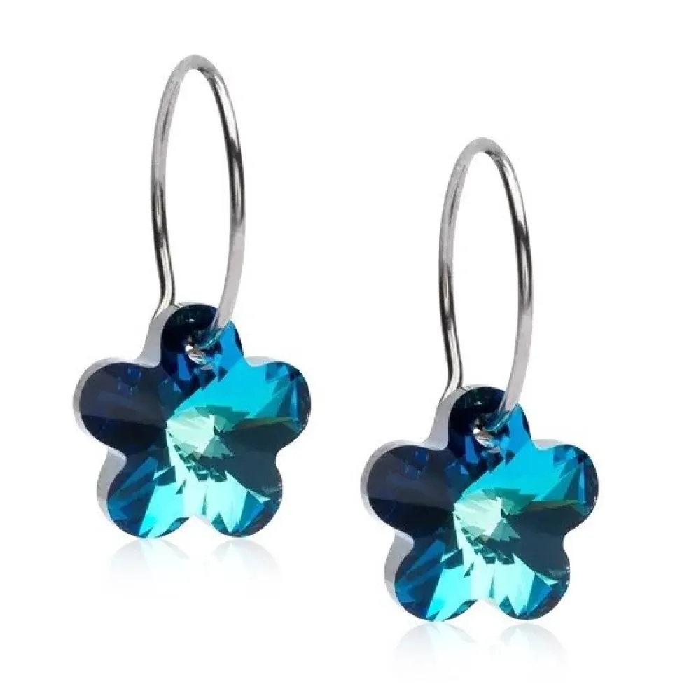 Hudvänliga örhängen i titan med en blommformad kristall på i mörkblått. Blomdahl kompromissar inte med hudvänligheten, utan använder endast speciellt utvald ren titan av medicinsk kvalitet.