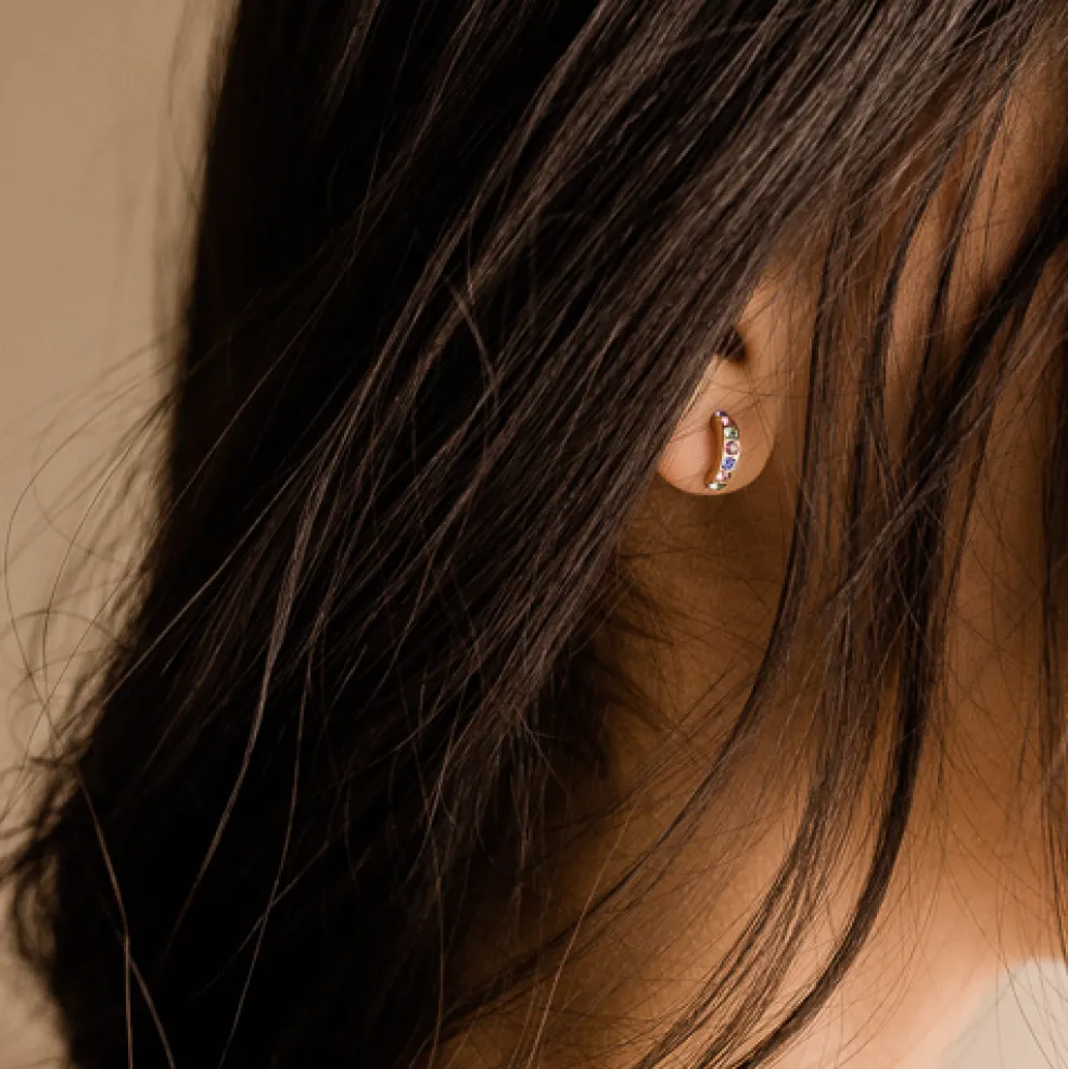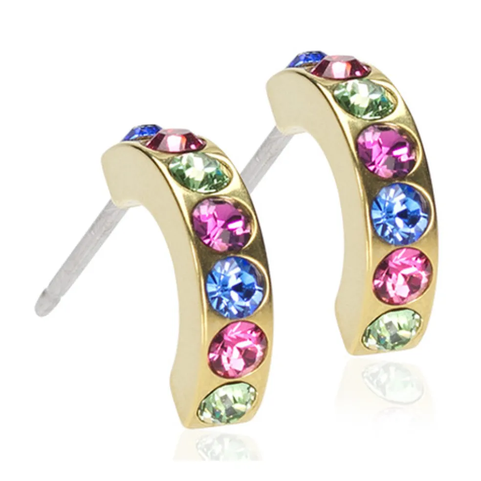 Denna modell är tillverkad i den hudvänliga metallen golden titanium. På örhänget sitter det totalt 7st små glittrande kristaller på rad.