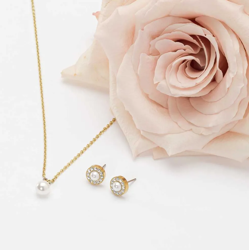 Runda örhängen i guldfärgad titan med klara kristaller samt en vit pärla på, modellen heter Brilliance Halo Pearl och kommer från varumärket Blomdahl Medical.