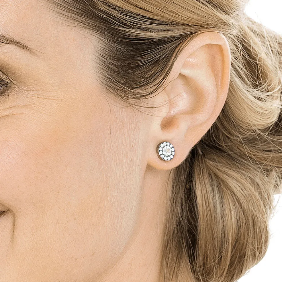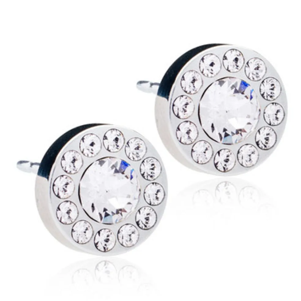 Runda örhängen i titan med klara kristaller på från Blomdahl Medical.