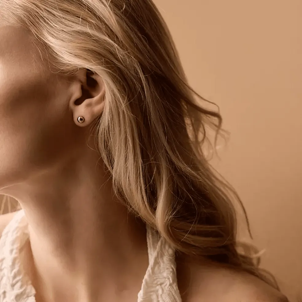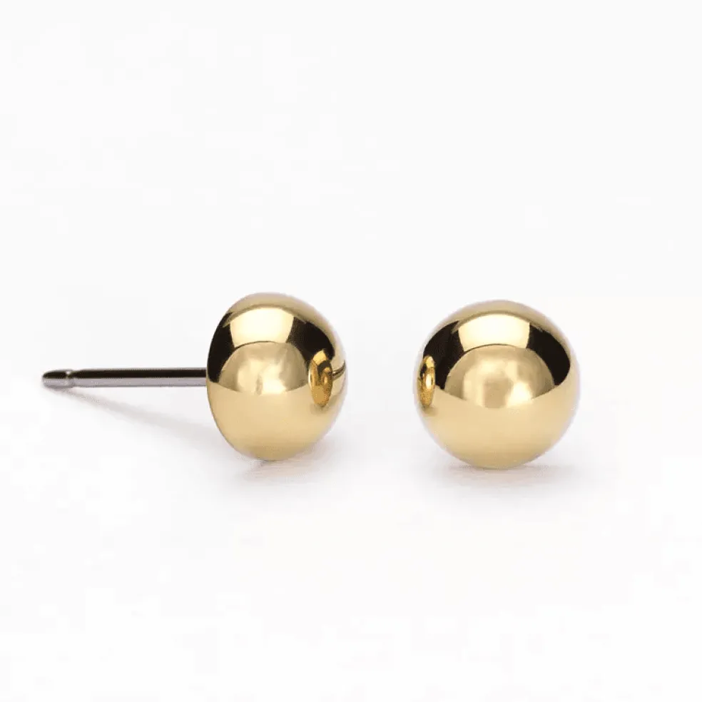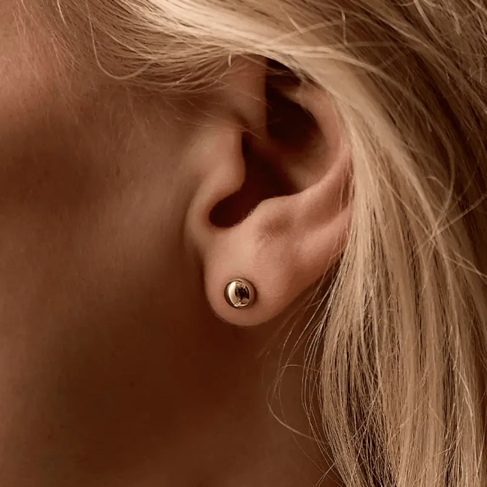 Stilrena, tidlösa och enkla örhängen i guldfärgat titan, designade som en halv boll – rundade utåt men platta mot örat för en bekväm passform. Den eleganta formen ger en klassisk look och passar perfekt för alla tillfällen.