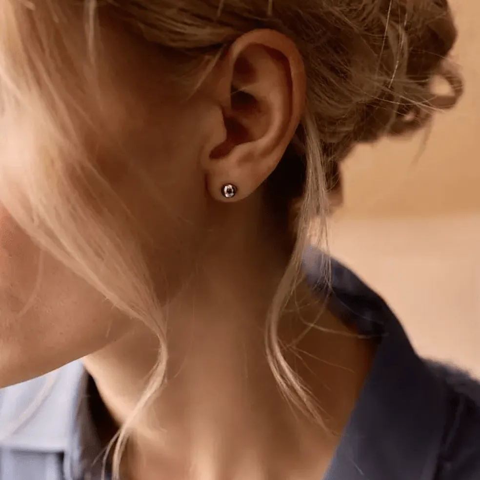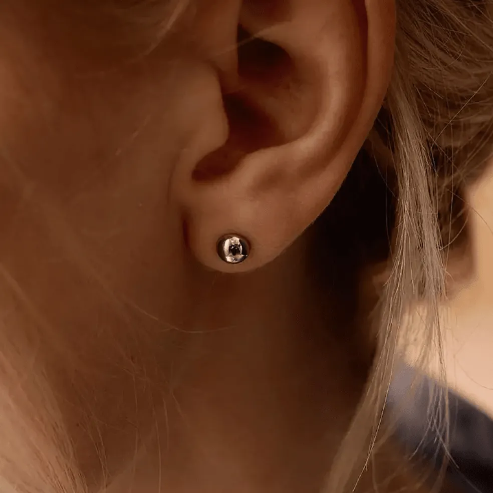 Ett par örhängen i titan, designade som en halv boll – rundade utåt men platta mot örat för en bekväm passform. Den eleganta formen ger en klassisk look och passar perfekt för alla tillfällen.