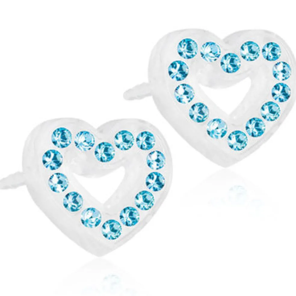 Hudvänliga örhängen i plast med blå kristaller på från Blomdahl Medical.