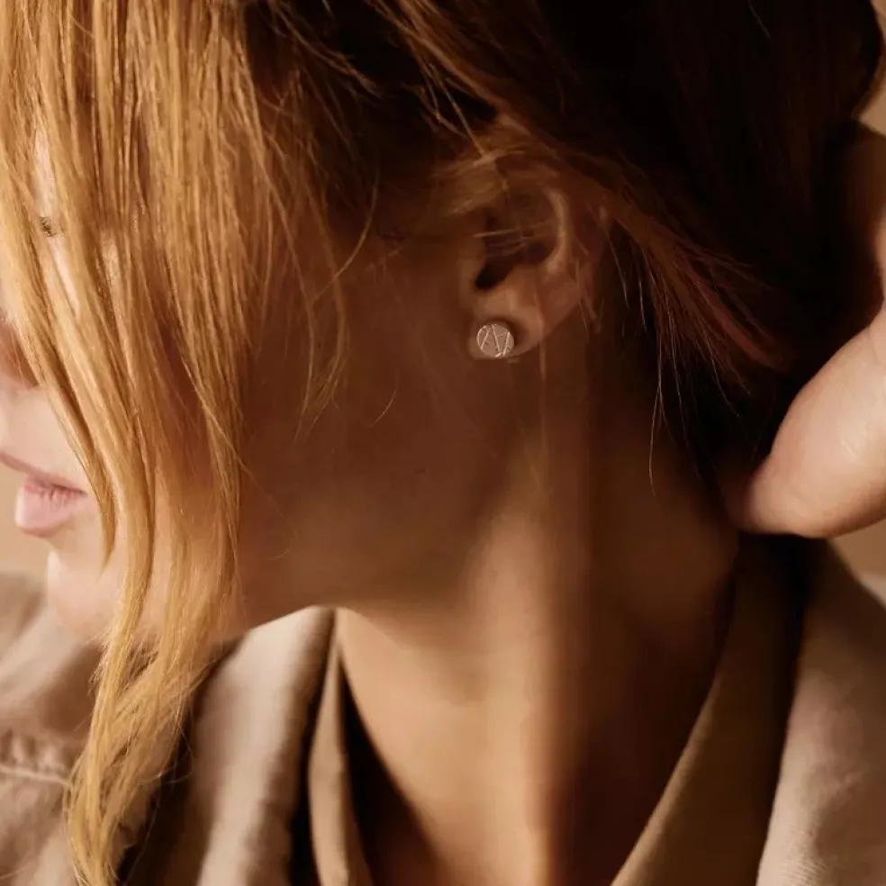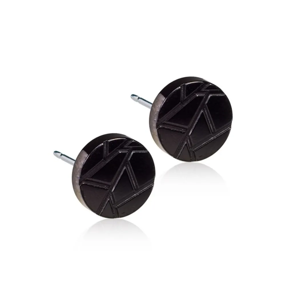 Hudvänliga örhängen i titan från Blomdahl, modellen heter Paragon och har en klassisk puckform, men med en twist. På örhänget är det ett grafiskt mönster i samma färg som örhänget, svart.