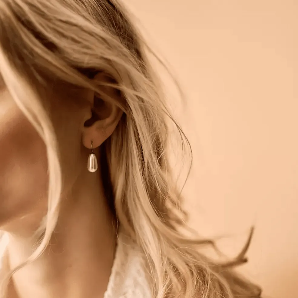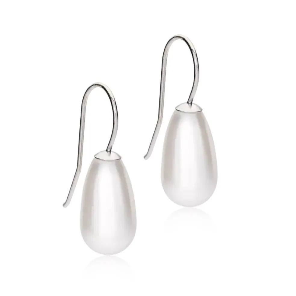 Örhängen på krok i ren medicinsk titan med en droppformad vit pärla, modellen kommer från Blomdahl Medical.