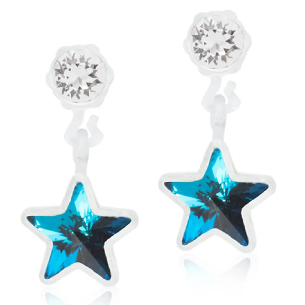 Hudvänliga örhängen i Medical Plastic från Blomdahl. Här med en hängande stjärna i blått.