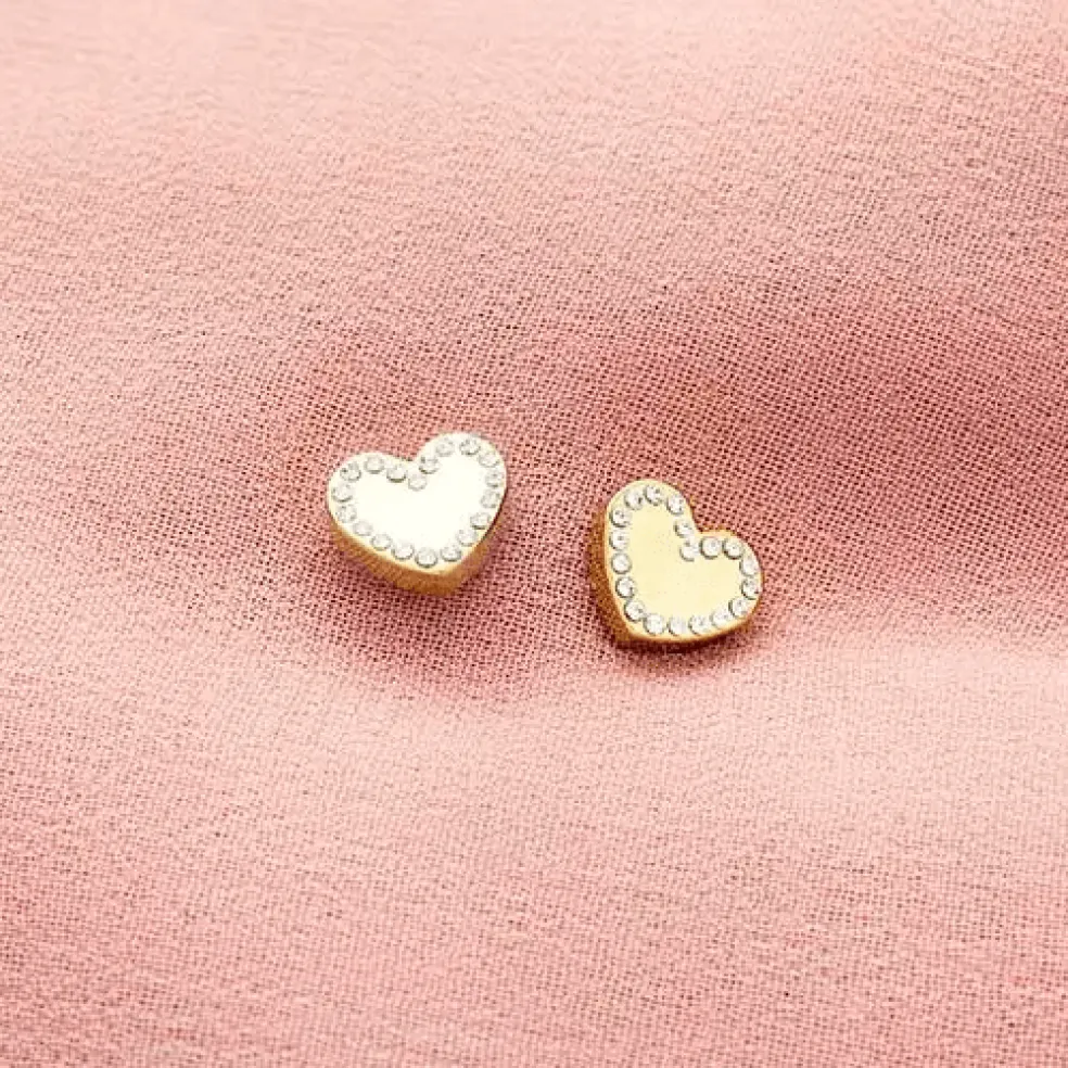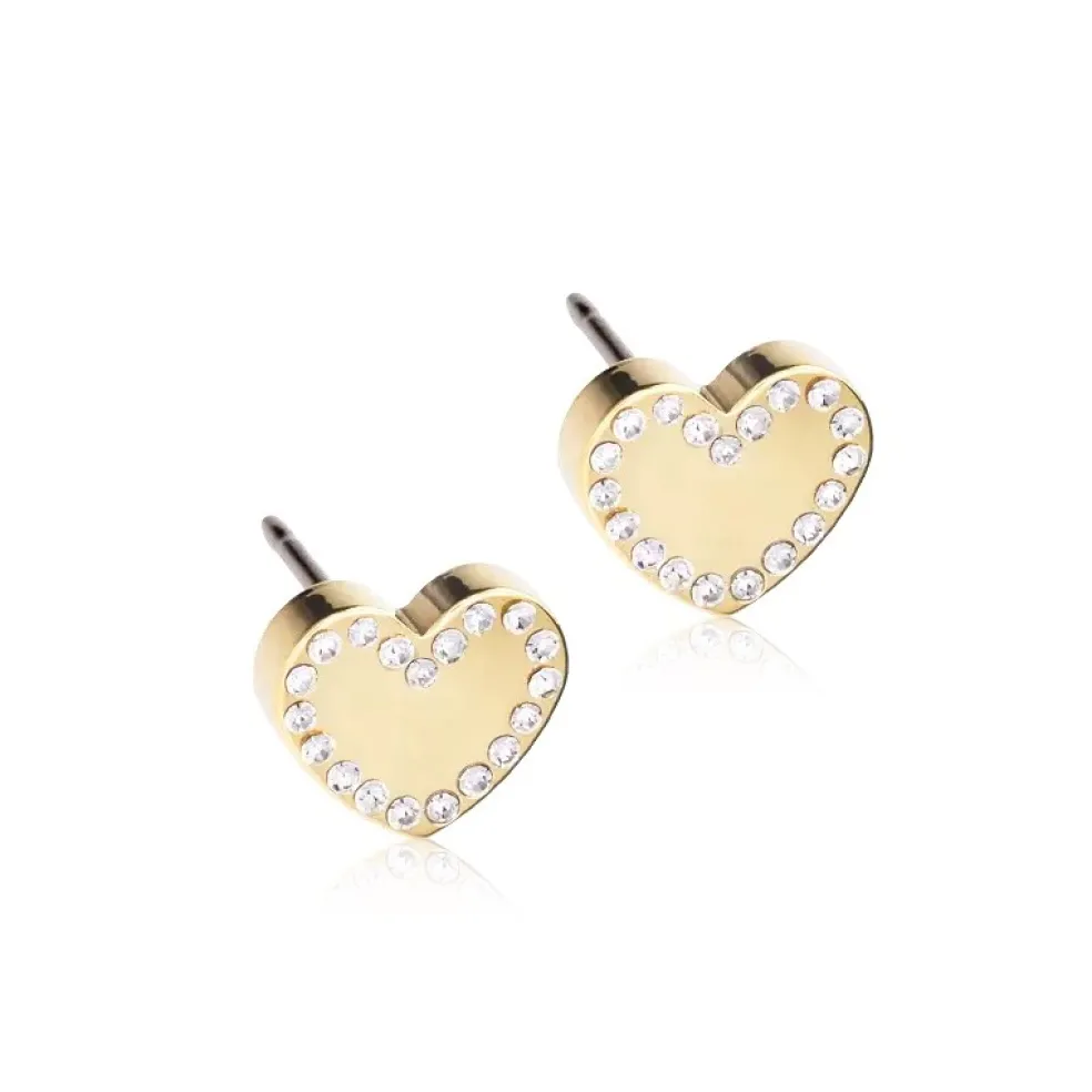 Eleganta hjärtformade örhängen i guldfärgat titan, dekorerade med en rad gnistrande klara kristaller. Den tidlösa designen ger en romantisk och touch, perfekt för både vardag och fest.