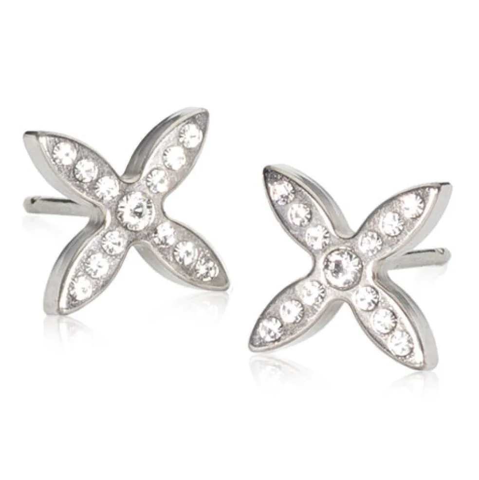 Om du letar efter riktigt hudvänliga örhängen så ska du absolut titta efter Blomdahls örhängen i titan av högsta kvalité. Denna modell har fått namnet "Twist" och ses här med klara kristaller på ren medicinsk titan.