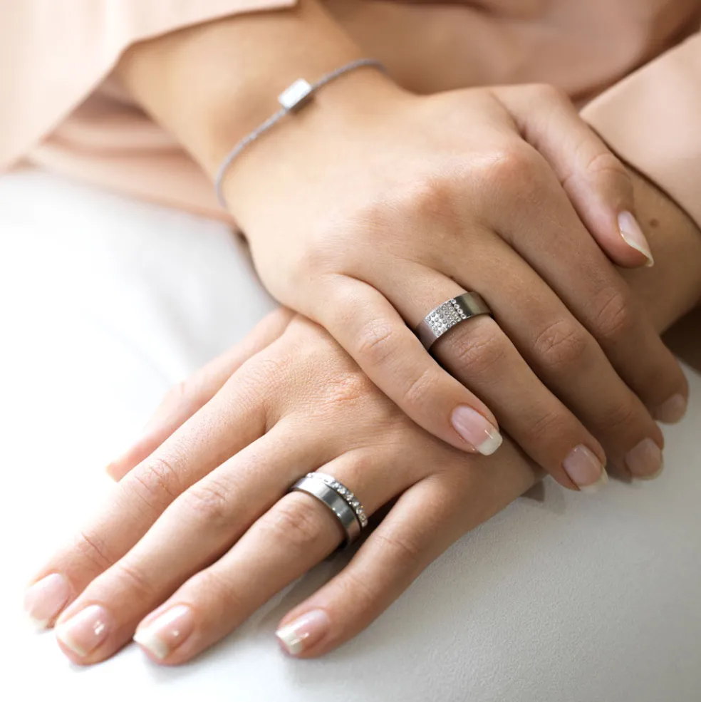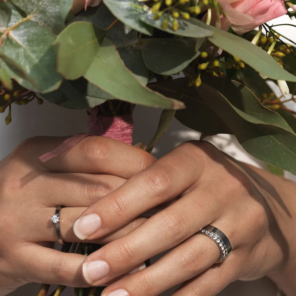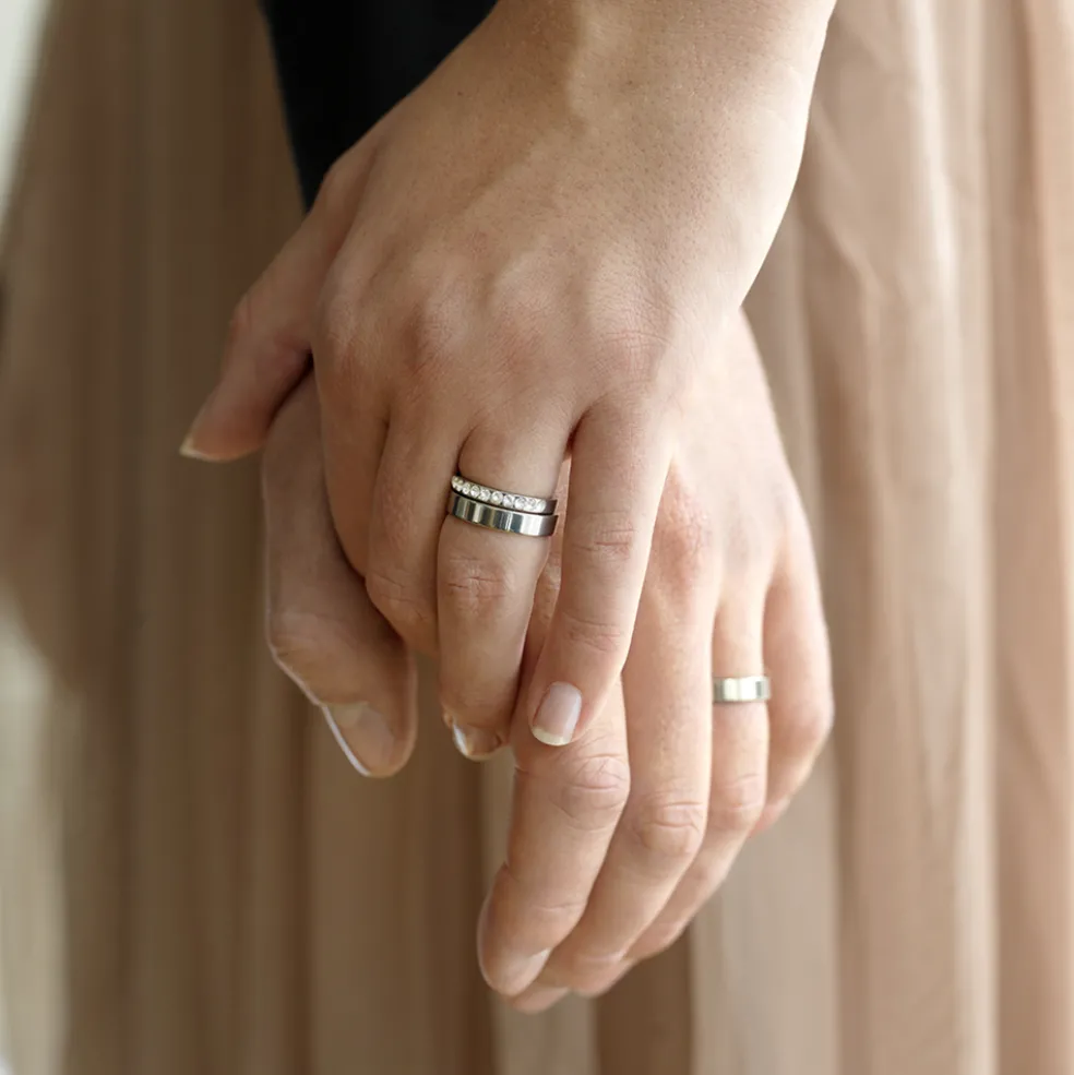 Ring utvecklad i samråd med hudläkare, materialet är medicinsk titan. Denna modell av ring passar utmärkt som förlovningsring till både henne och honom.