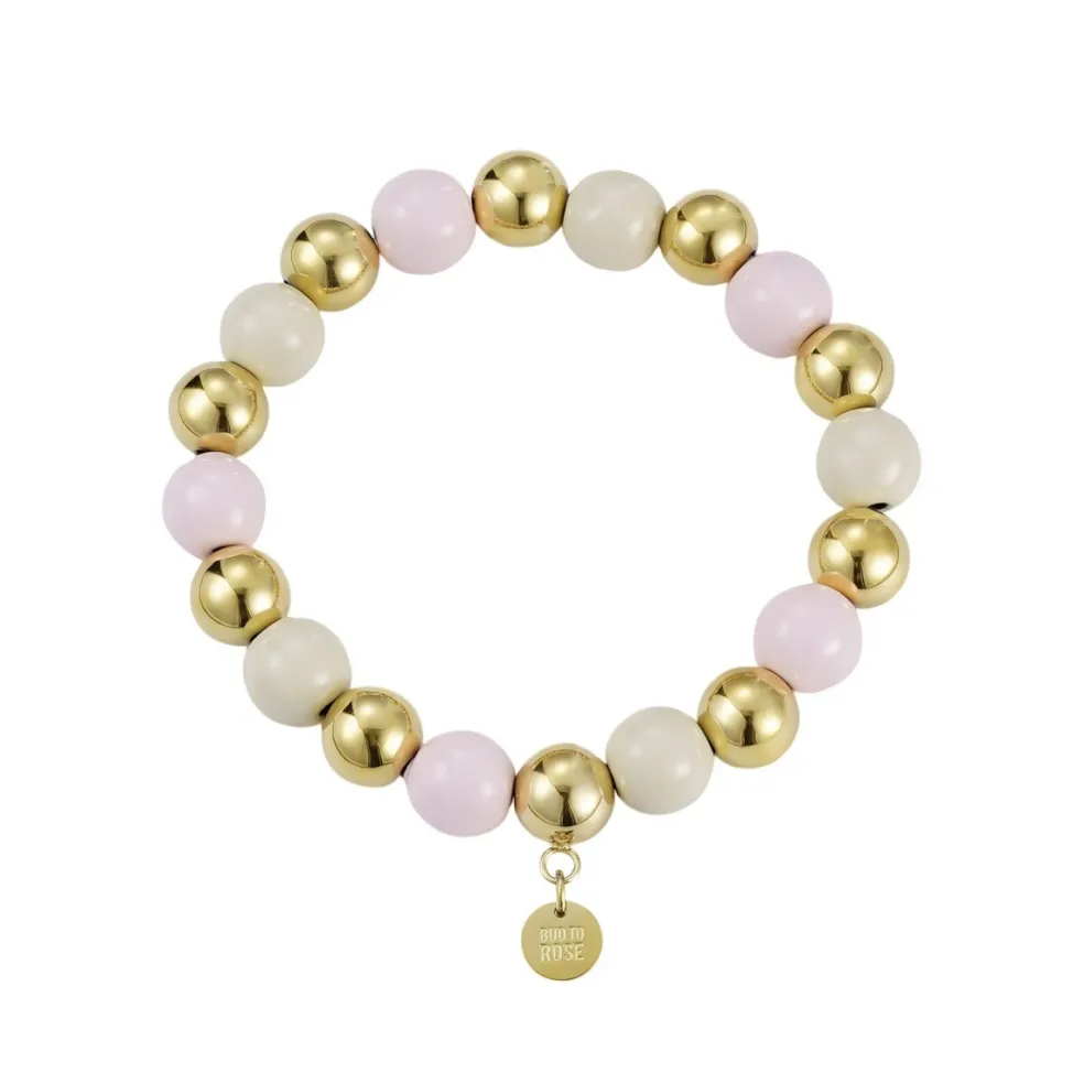 Den stilrena designen med tre kulor i en vacker mix av guld, ljusrosa och beige ger en feminin och modern känsla som passar till alla tillfällen. Armbandet är elastiskt och bekvämt, vilket gör att det sitter snyggt på alla handleder. Bär det för sig själv eller matcha med ringen för en komplett look i din nya favoritkombination.