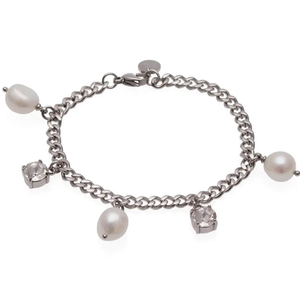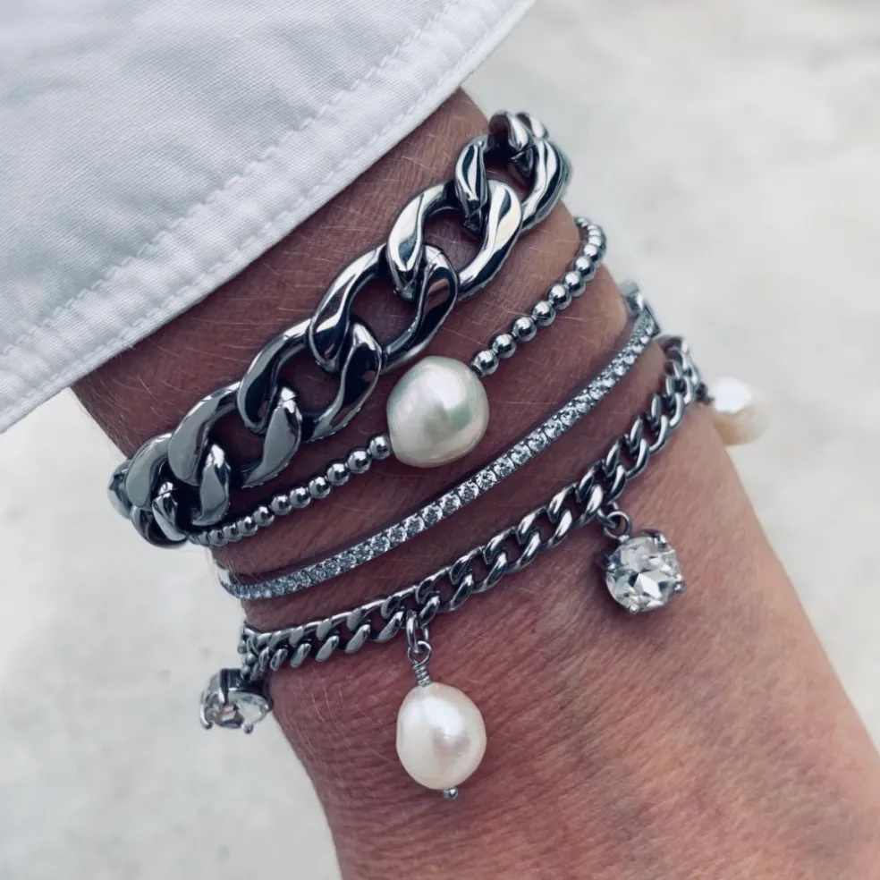 En lite bredare panzarlänk i stål med två klara kristaller samt tre vita sötvattenspärlor. Pärlorna kan variera i form och nyans då det är naturliga pärlor.