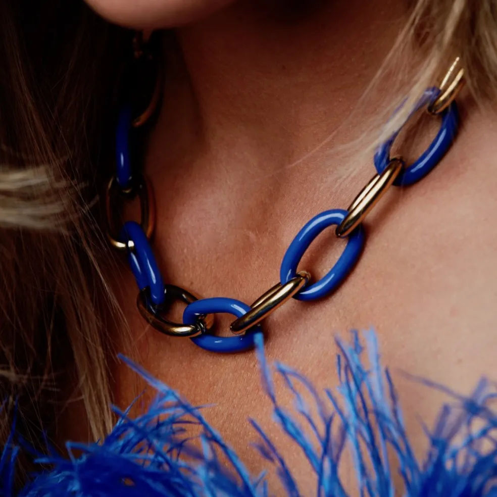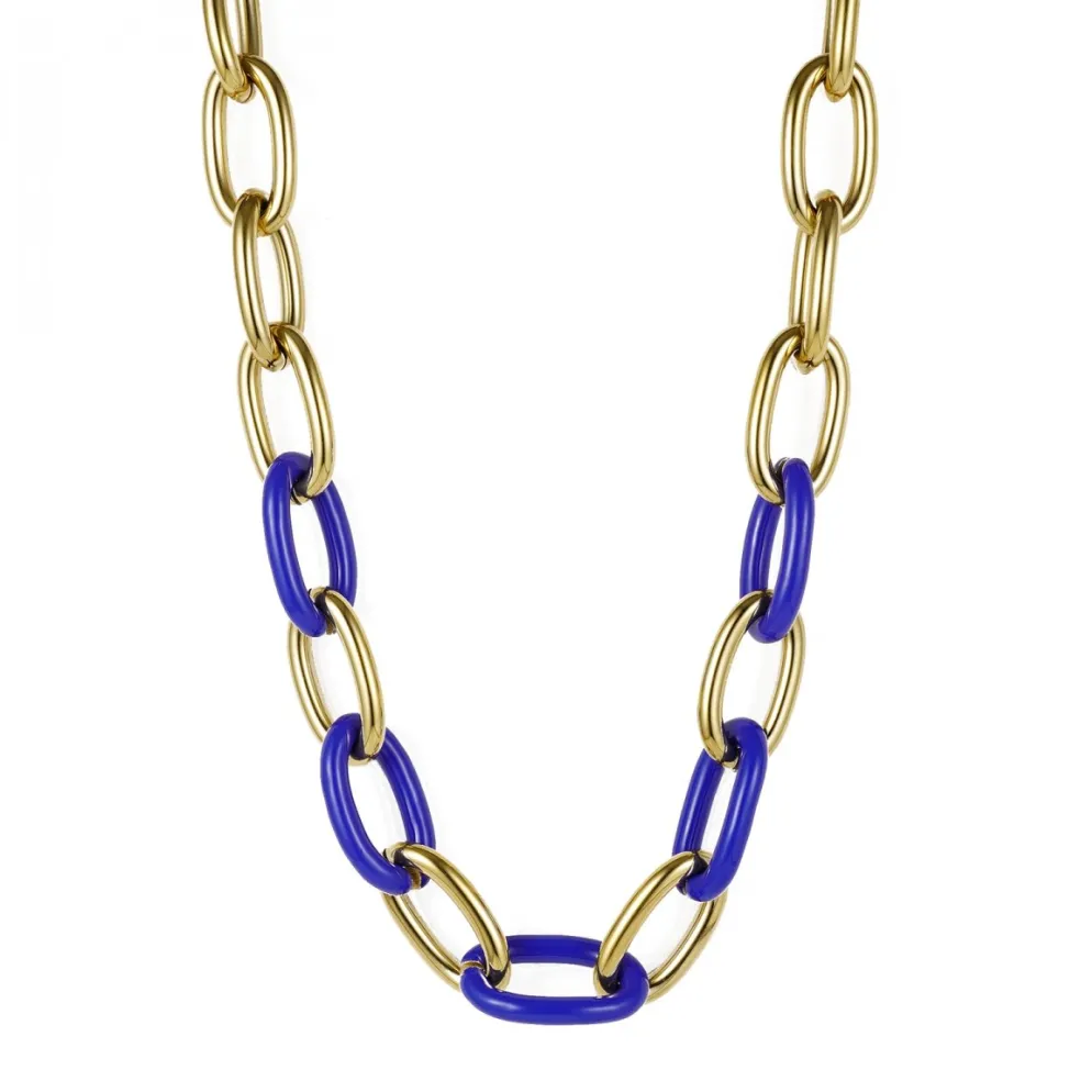 Läckert halsband med stora kraftiga länkar i guldplätering och blå emalj, modellen heter Granada och kommer från varumärket Bud To Rose.