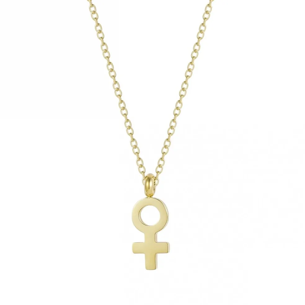 Halsbandet Woman i 14 karats guldpläterat stål är en symbol för kvinnor som stöttar och hjälper andra kvinnor.