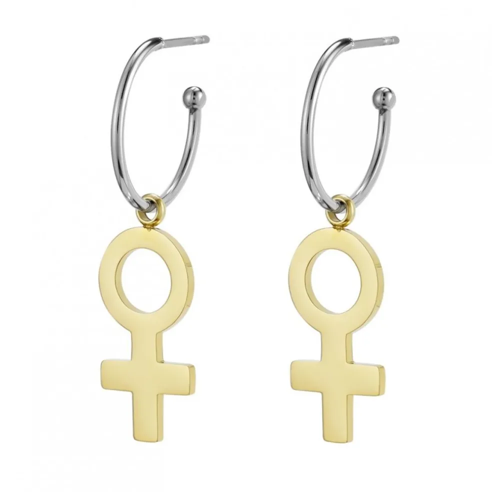 Ringörhängen med ett hängande kvinnotecken / venustecken, här i stål och 14 karats guldpläterat stål.