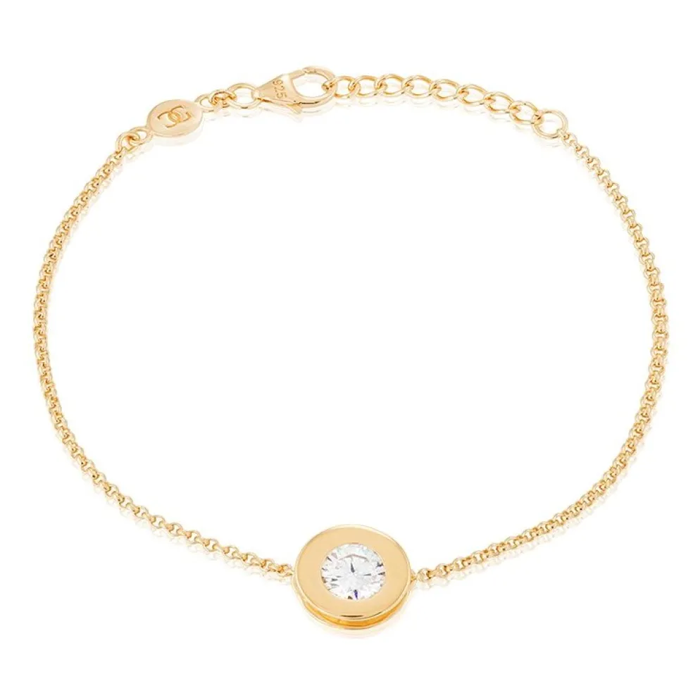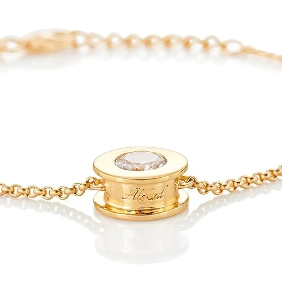 Stilrent armband i 24 karats guldpläterat silver med en klar Cubik Zirkonasten i en rund fattning och texten "Älskad" ingraverad på baksidan.
