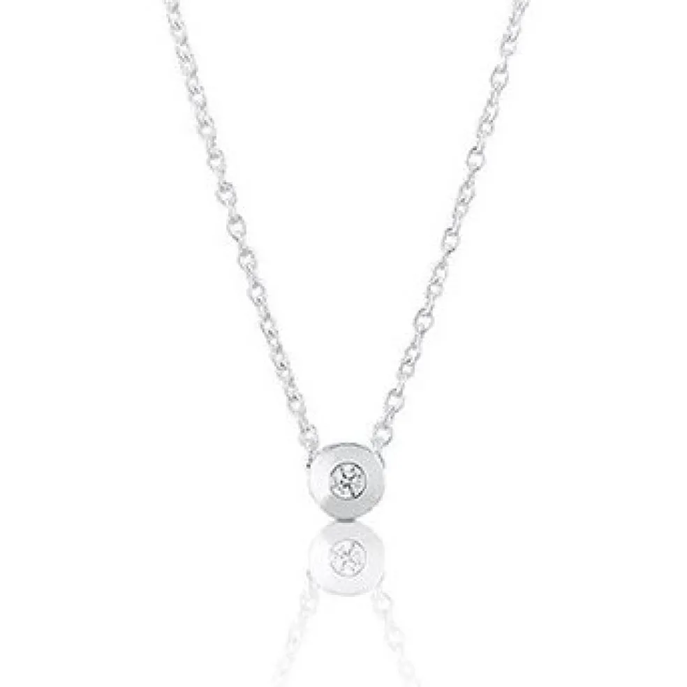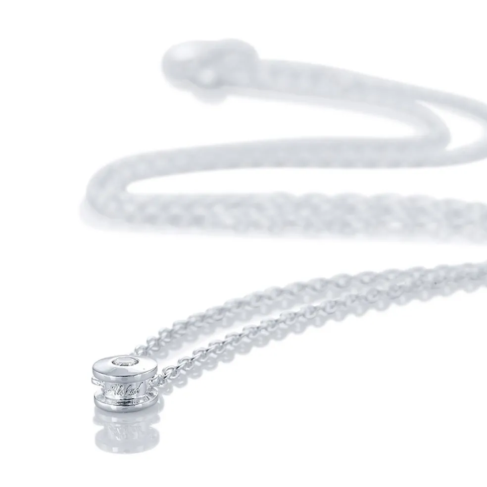 Stilrent halsband i äkta silver med en klar Cubik Zirkonasten i en rund fattning och texten "Älskad" ingraverad på insidan. Detta är den lite mindre modellen där hänget är ca 0,6cm.