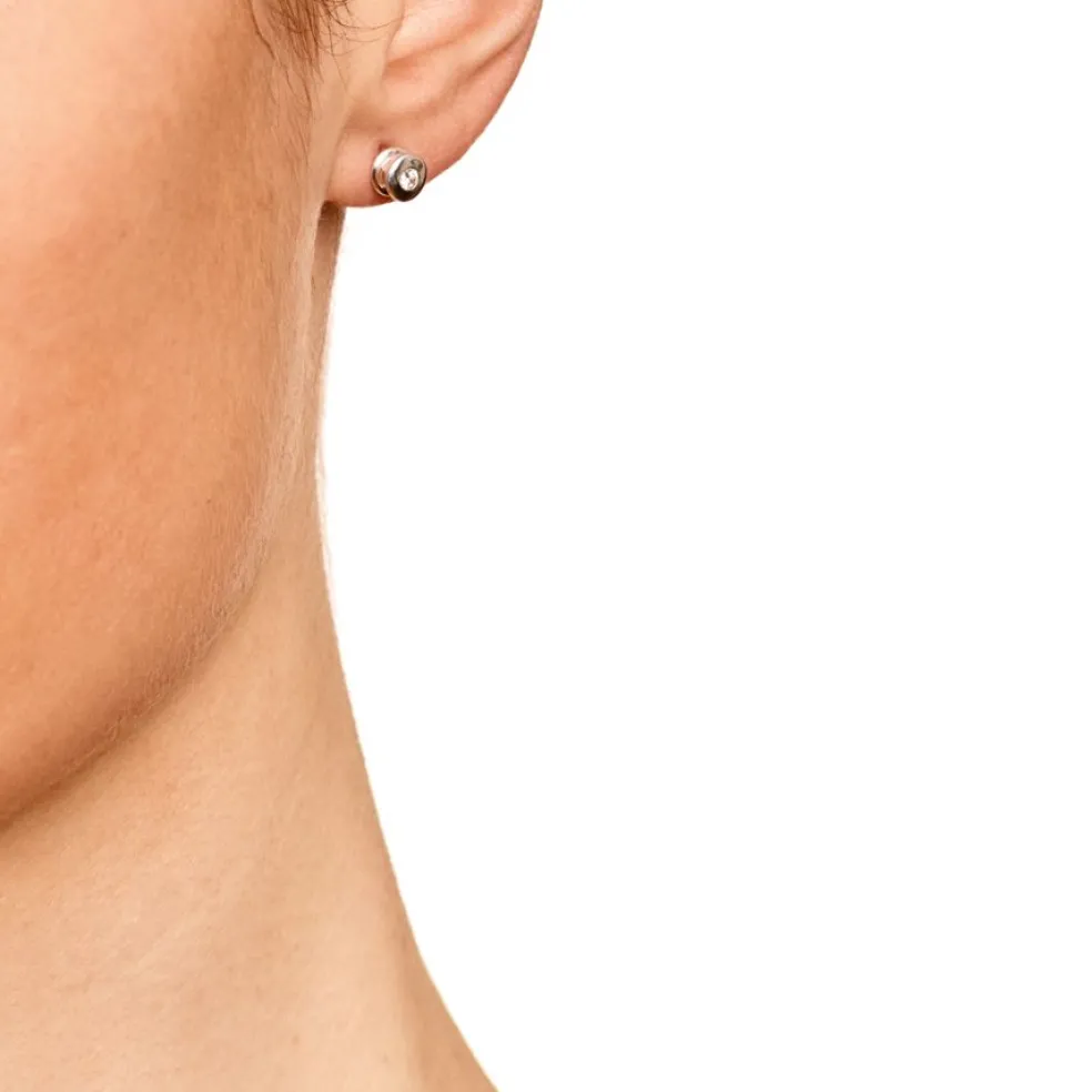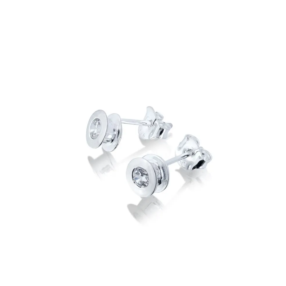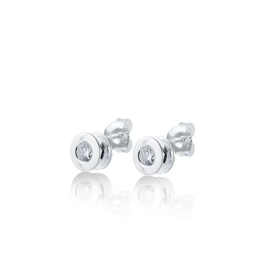 Fina örhängen i äkta silver med en klar Cubik Zirkonasten i en rund fattning och texten "Älskad" ingraverad på insidan.