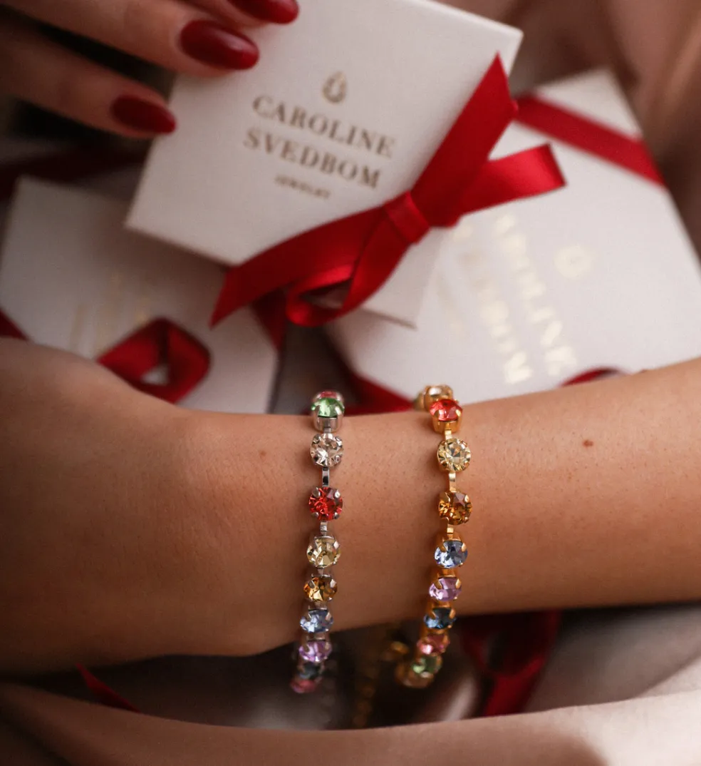 Childhood Edition-armbandet är inte bara ett vackert smycke; den bär ett djupt budskap i samarbete med World Childhood Foundation och FN:s konvention om barnets rättigheter. Varje kristall i armbandet representerar en artikel från denna konvention, som symboliserar de grundläggande rättigheter som varje barn förtjänar. De livfulla färgerna tjänar som en påminnelse om vikten av en barndom fri från sexuella övergrepp. Genom att bära Childhood-armbandet går du med oss i vårt engagemang för att göra en positiv inverkan.