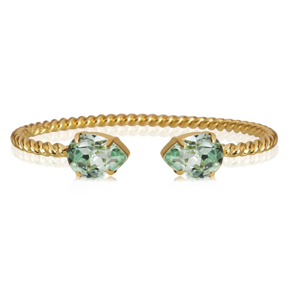 Tidlöst armband med grön kristall från Caroline Svedbom. Armbandet har en känsla av rep tack vare den vackert vridna metallen. Armbandet avslutas med två droppformade kristaller av bästa kvalité i den ljusgröna färgen Chrysolite.