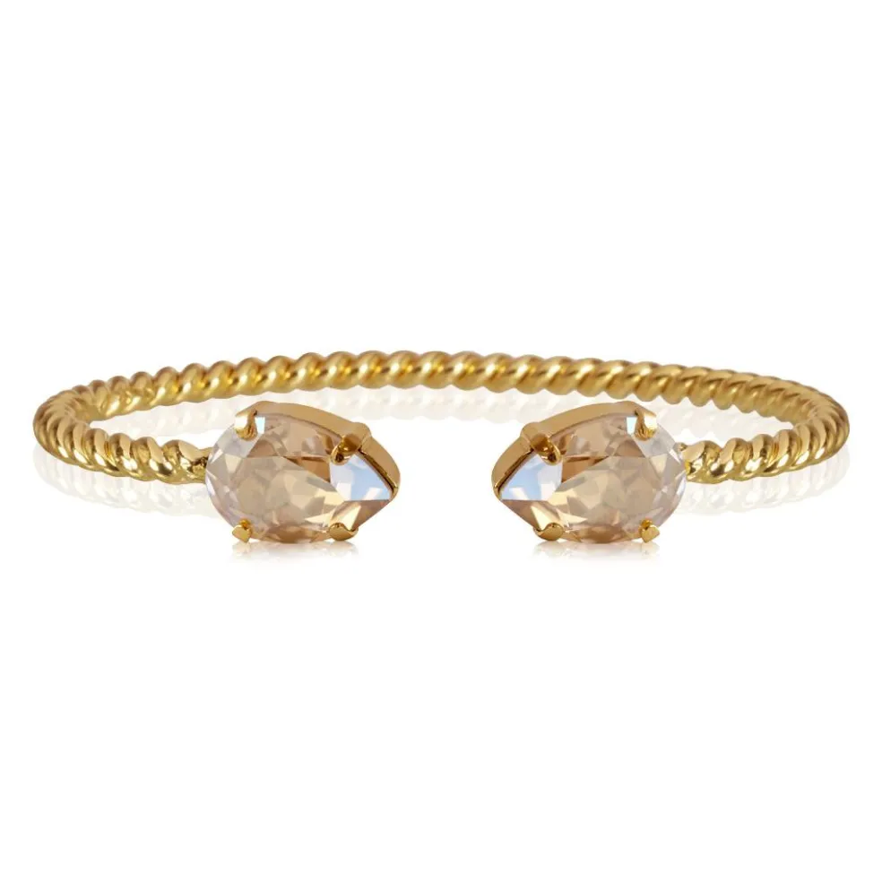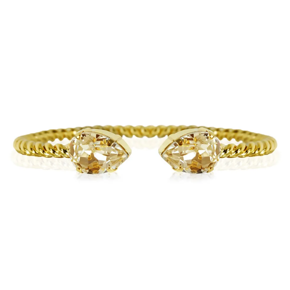 Ett elegant armband från Caroline Svedbom med vackert vriden metall. Armbandet avslutas med två droppformade kristaller av bästa kvalité.