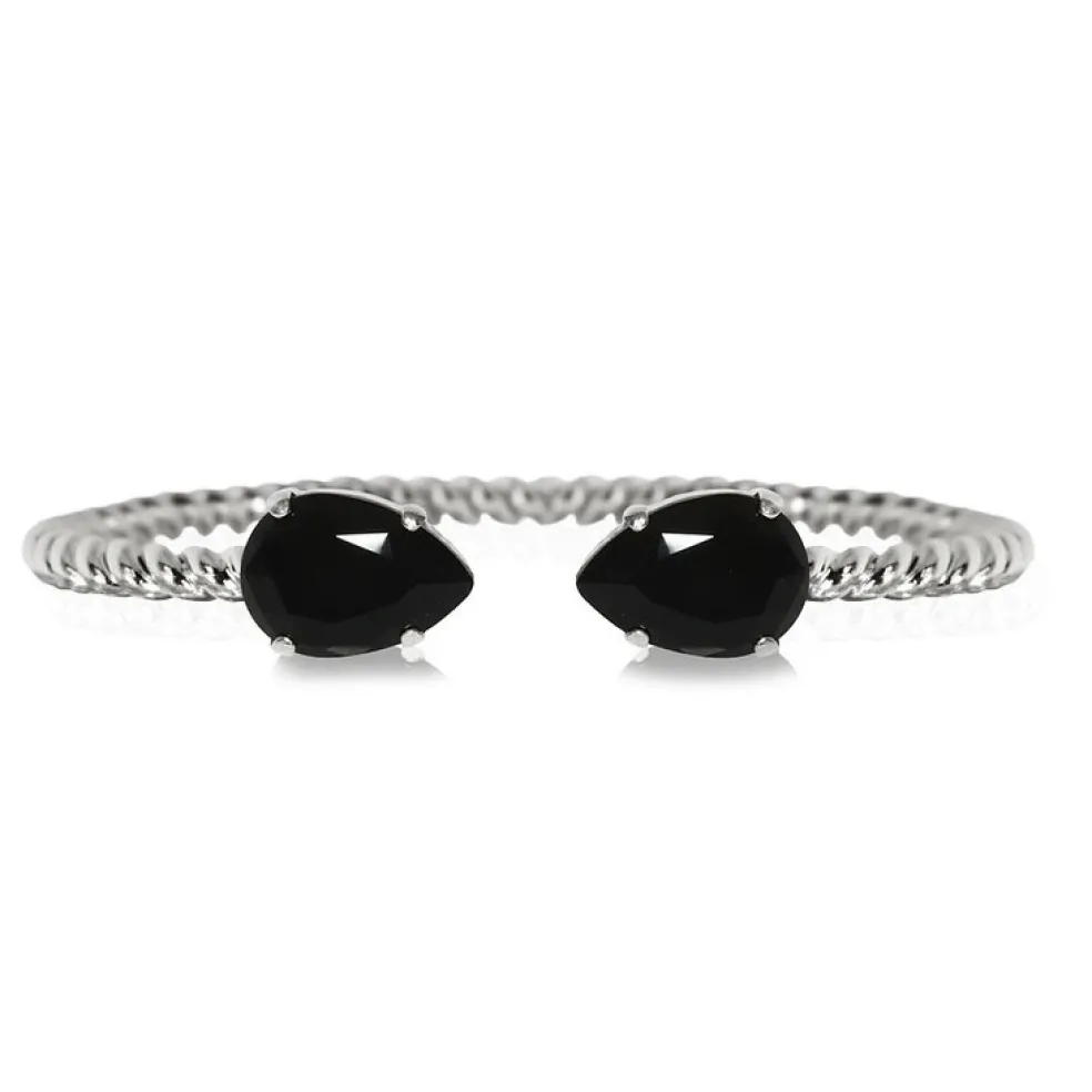 Ett elegant armband i rhodiumplätering från Caroline Svedbom med vackert vriden metall. Armbandet avslutas med två droppformade kristaller av bästa kvalité, här i svart – Jet.