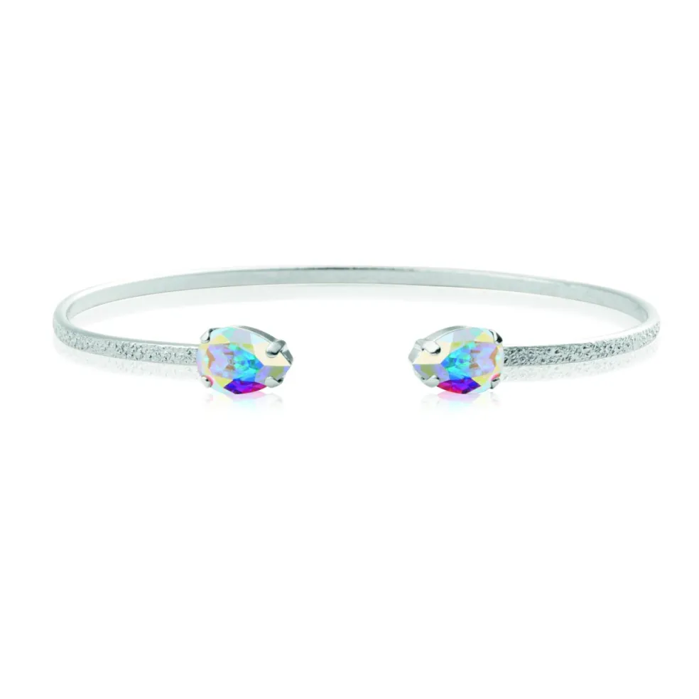 På armbandet sitter två små droppformade kristaller med en färg som har ett fint skimmer. Bär armbandet ensamt eller stapla det med dina favorit armband.