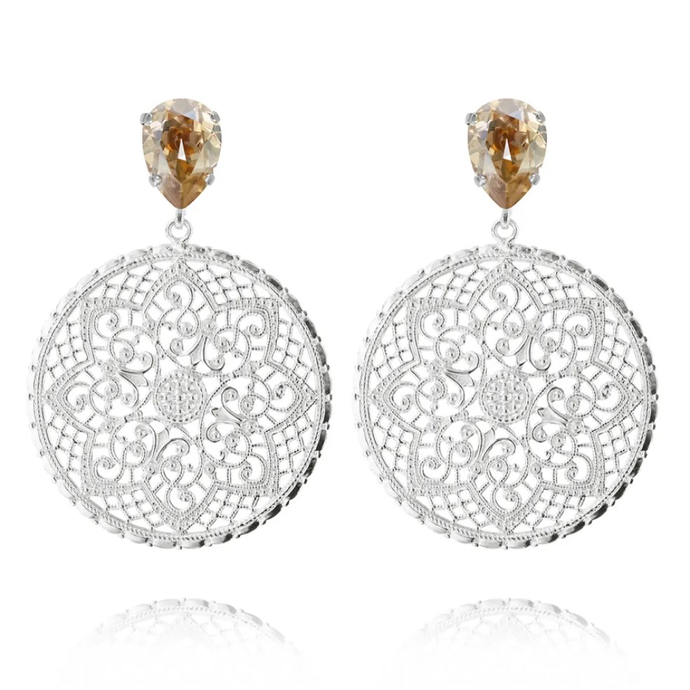 Örhängen av modellen Alexandra med en droppformad och fasettslipad kristall på samt en stor cirkel från varumärket Caroline Svedbom. Trots sin storlek är örhängena lätta. Örhängena är rhodium färgade och har kristall i färgen golden shadow.