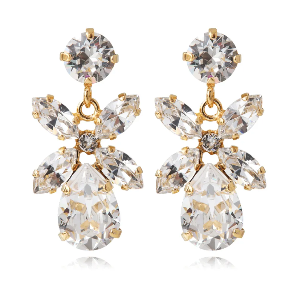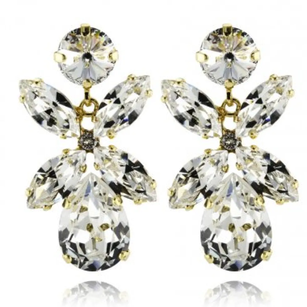 Dione är en modell som passar dig som vill ha örhängen som syns ordentligt. Oavsett om du har håret uppsatt eller utsläppt så går det inte att missa glittret från de stora kristallerna. Formen föreställer en blomma. Varje del är rörlig och det gör att Dione örhängen känns livfulla och intressanta. Det är kristallerna som tar största plats och det är också något som ger en känsla av lyx. Med dessa Caroline Svedbom så blir det mer glädje, skönhet och inspiration för årets alla dagar.