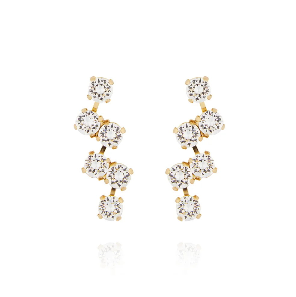 Vackra örhängen med totalt sex stycken kristaller på, här ser Ni modellen Fiona i guldplätering med klara kristaller.