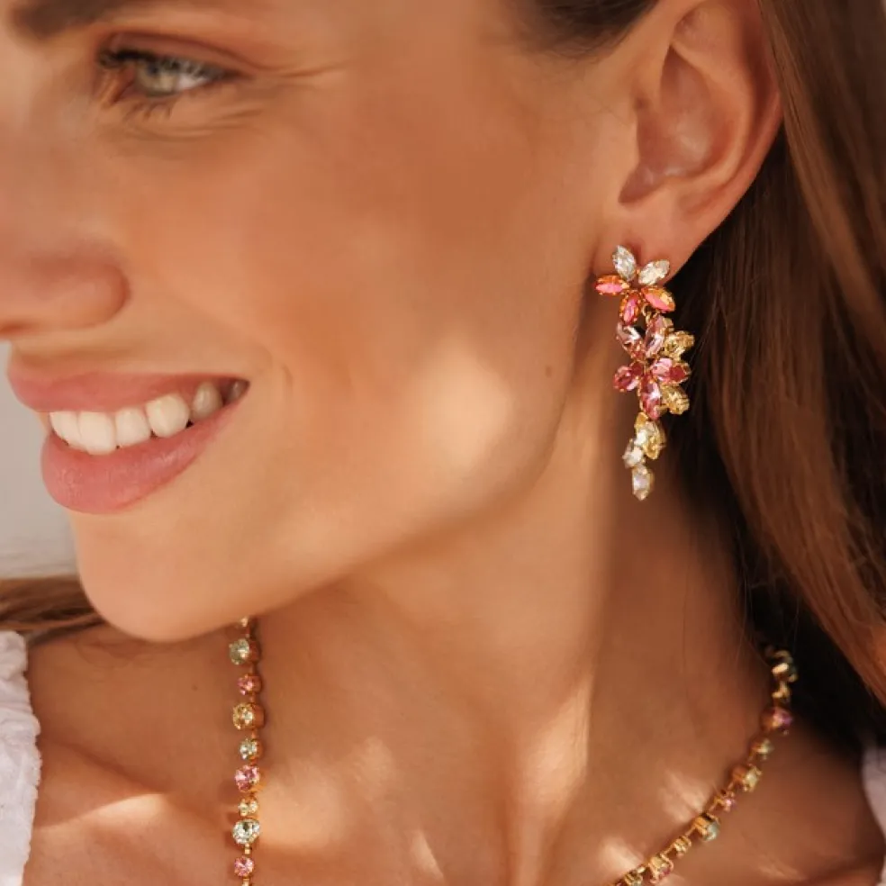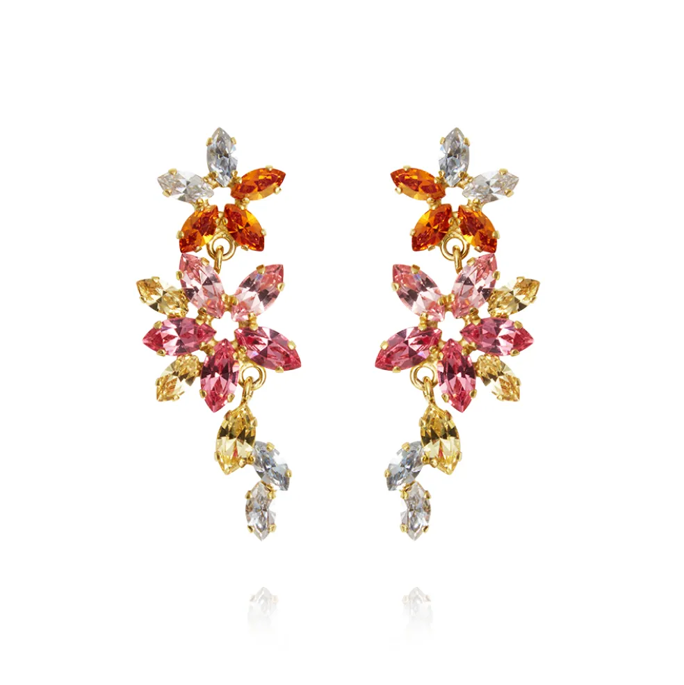 Elegant kristall örhängen från varumärket Caroline Svedbom. Kristallerna har färgerna klar, gul, orange, rosa i två nyanser.