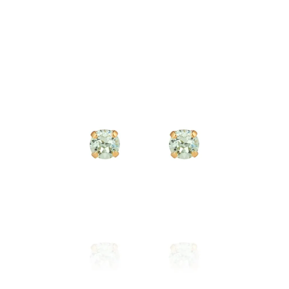 Små runda studsörhängen i färgen Chrysolite från Caroline Svedbom, modellen heter Mini Stud och ses här i 18 karats guldplätering.