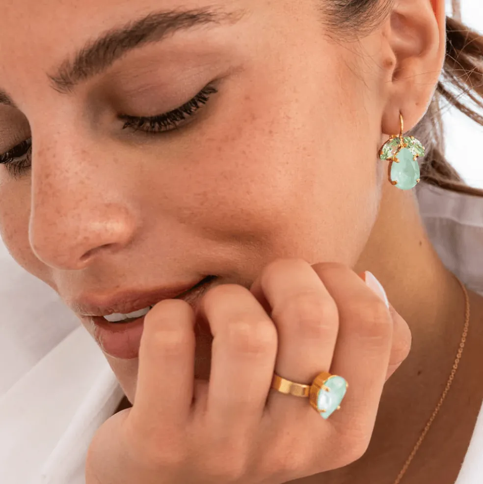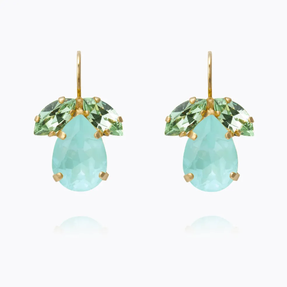 Timo är ett par eleganta och snygga örhängen med en droppformad sten och två mindre kristaller på sidorna. Dessa örhängen är tillverkade med gnistrande kvalitets kristaller på en elegant krok. Örhänget har en 18 karats guldplätering och färgkombinationen Soft Mint Combo.