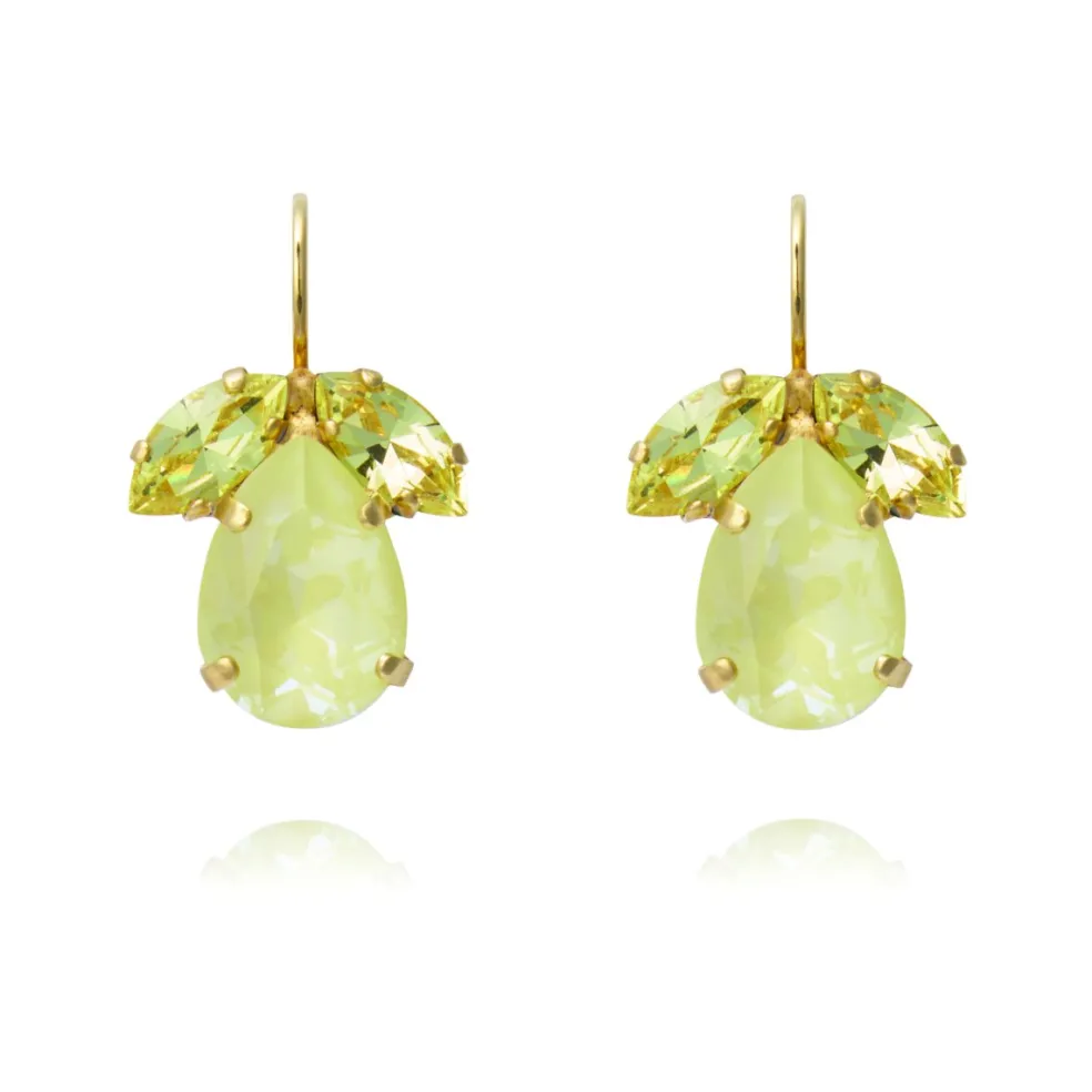 Timo är ett par eleganta och snygga örhängen med en droppformad sten och två mindre kristaller på sidorna. Här ser Ni örhänget i 18 karats guldplätering och färgkombinationen Soft Yellow Combo.