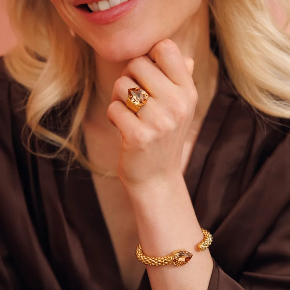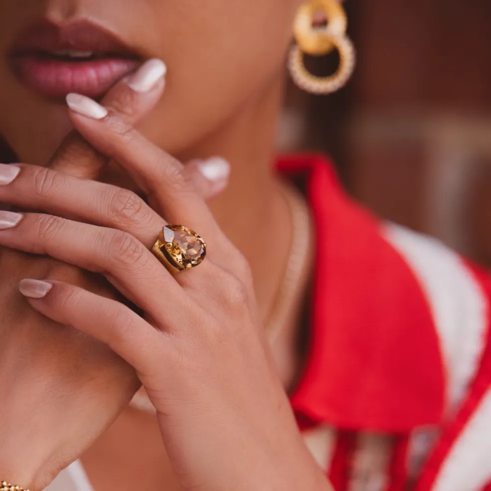 Den eleganta ringen Classic Drop från Caroline Svedbom är skapad för att dra blickarna till sig. Med en stor, droppformad kristall i den förtrollande nyansen Light Colorado Topaz, är detta smycke en hyllning till både tidlös stil och modern design. Kristallens varma, gyllene ton för tankarna till en mjuk solnedgång, där varje fasett fångar och reflekterar ljuset på ett magiskt sätt.