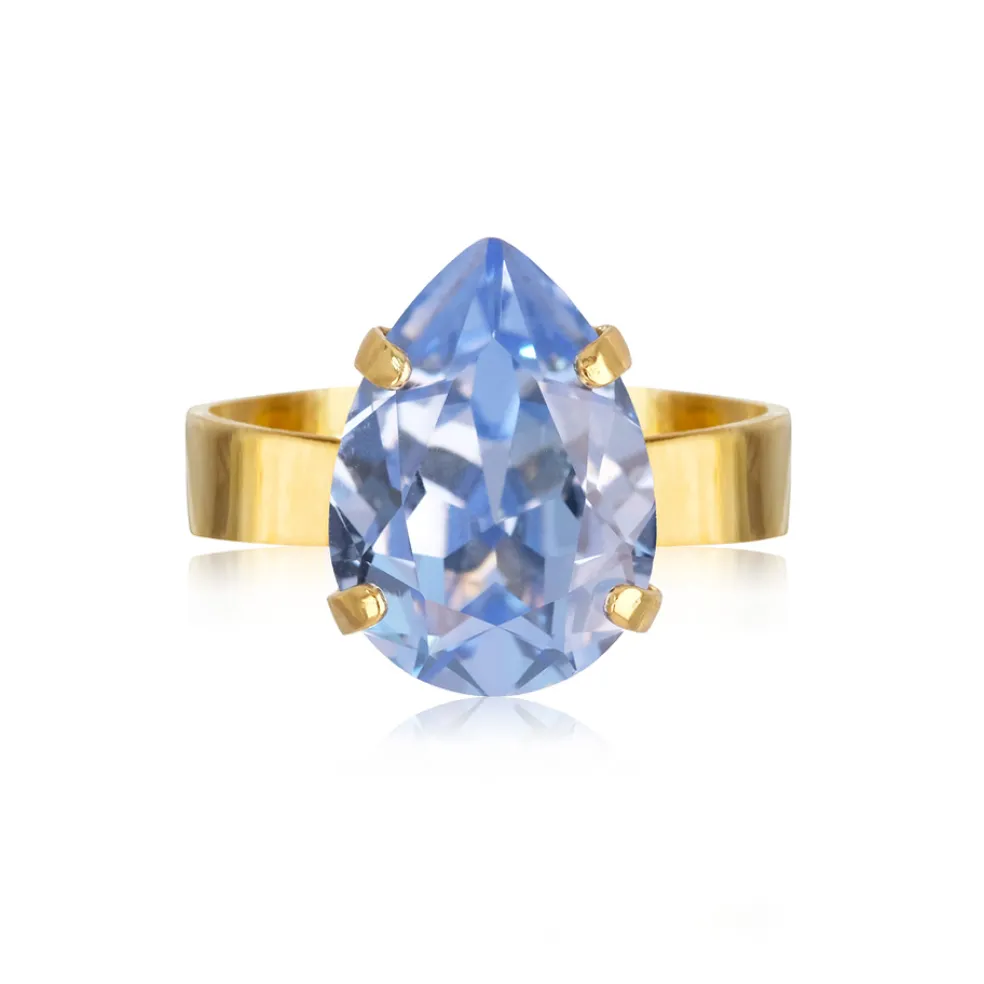 Ring av modellen Mini Drop från varumärket Caroline Svedbom med en droppformad kristall på, här i ljusblått. Ringen har en öppen baksida som lätt kan justeras från ca 16 till 21mm.
