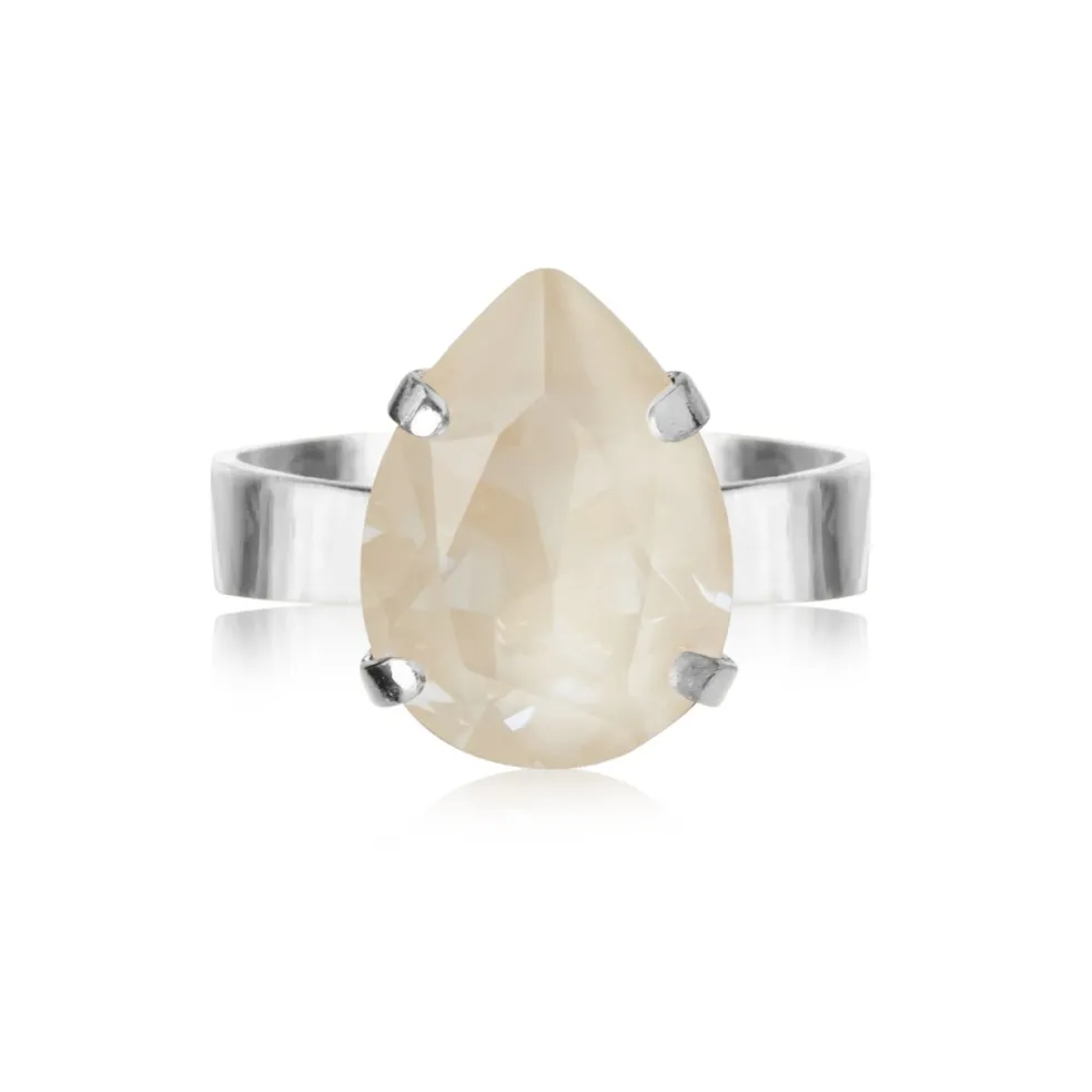 RIngen Mini Drop från Caroline Svedbom är en riktig "stjärna" bland smycken. Tillverkad med rhodiumplätering, bär den en vit mjölkig kristall som lyser upp dess skönhet och ger en härlig känsla av lyx. Rhodiumpläteringens likhet med vitt guld förstärker ringens exklusiva utseende och ger den en känsla av högkvalitativt hantverk.