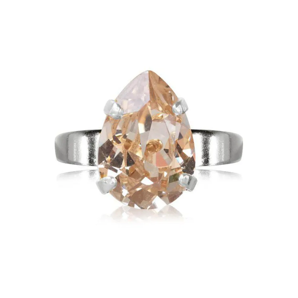 Caroline Svedboms Mini Drop ring är utan tvekan en av deras mest populära och ikoniska modeller. Denna ring är rhodiumpläterad och har en kristall i ljusbeige färg.