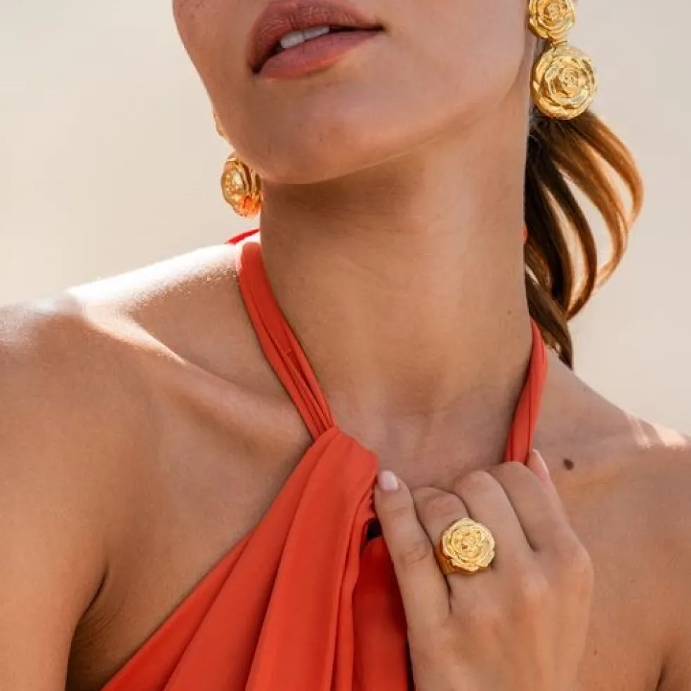 Ringen är noggrant tillverkade av högkvalitativ metall med 18 karats guldplätering, modellen heter Rosita och kommer från Caroline Svedbom.