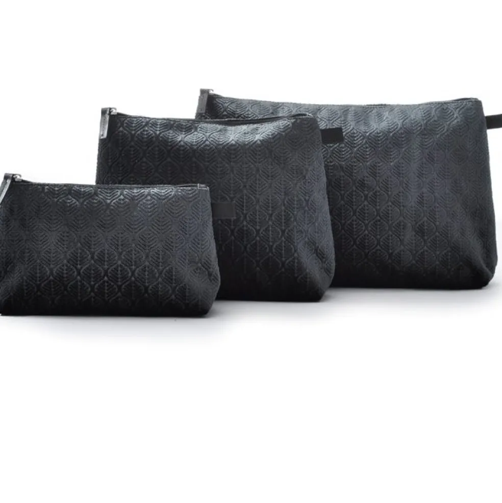 Necessären är fodrad med ett avtorkningsbart tyg och den försluts med dragkedja.