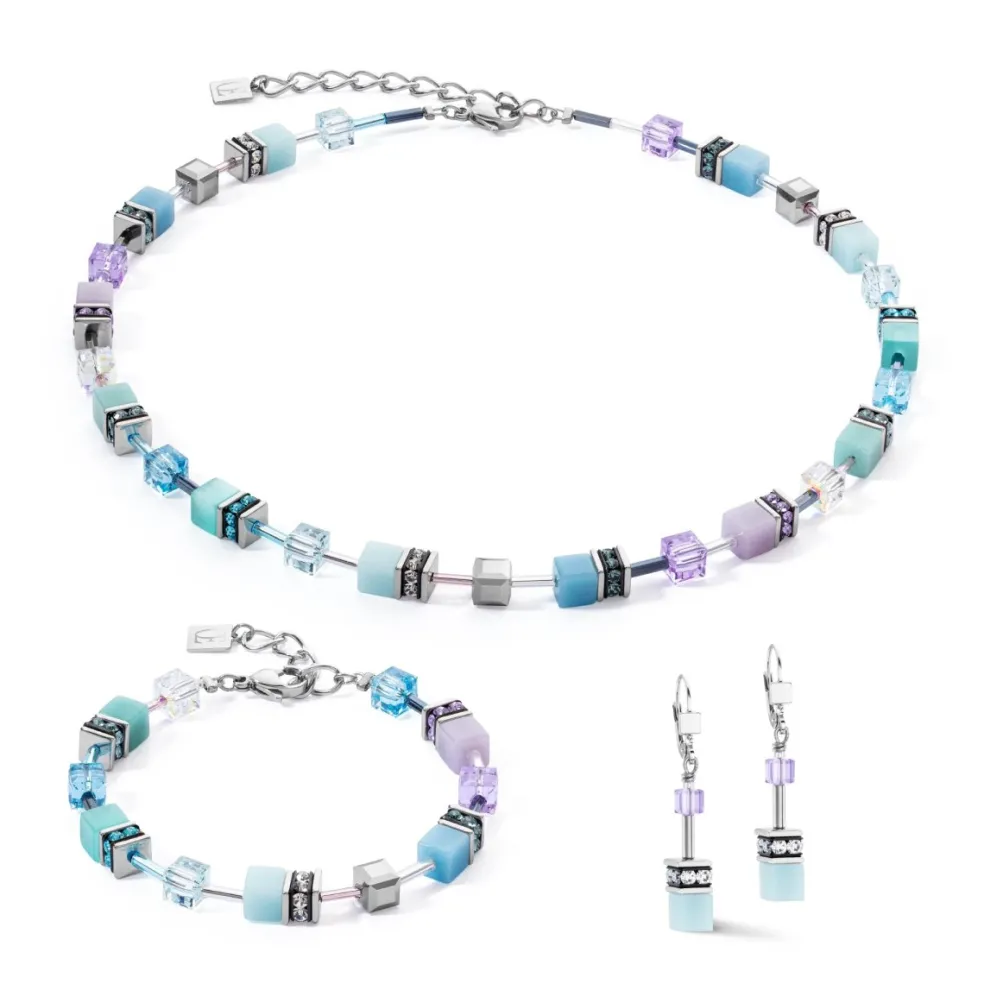 GeoCUBE-armbandet kombinerar kuber av akryl, glas och polerat rostfritt stål i olika ljusblå toner med inslag av lila. Denna unika färgkombination påminner om kristallklart vatten och solnedgångens mjuka pasteller, vilket ger en fräsch och sommrig look. De ljusa blå tonerna symboliserar lugn och harmoni, medan de lila inslagen tillför mystik och elegans.