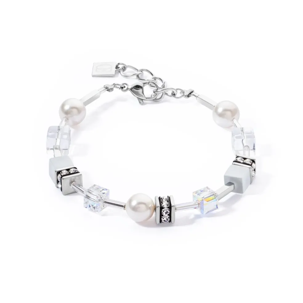 Upptäck Coeur de Lions armband GeoCUBE® Iconic Pearl Mix, ett elegant smycke som kombinerar hållbart stål, vita pärlor samt vita och klara kristaller på ett utmärkt sätt.