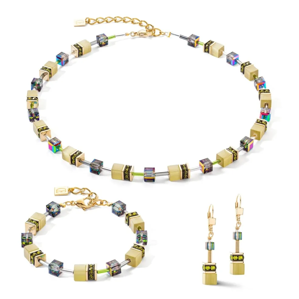 Armbandet i olivgrönt från Coeur de Lion förenar en elegant grön nyans med glänsande guld och färgglada, skimrande kristallkuber, vilket skapar en iögonfallande och exklusiv look. Den ljusa olivgröna färgen med en ton av gult ger en elegant kontrast till de gyllene och glittrande detaljerna.